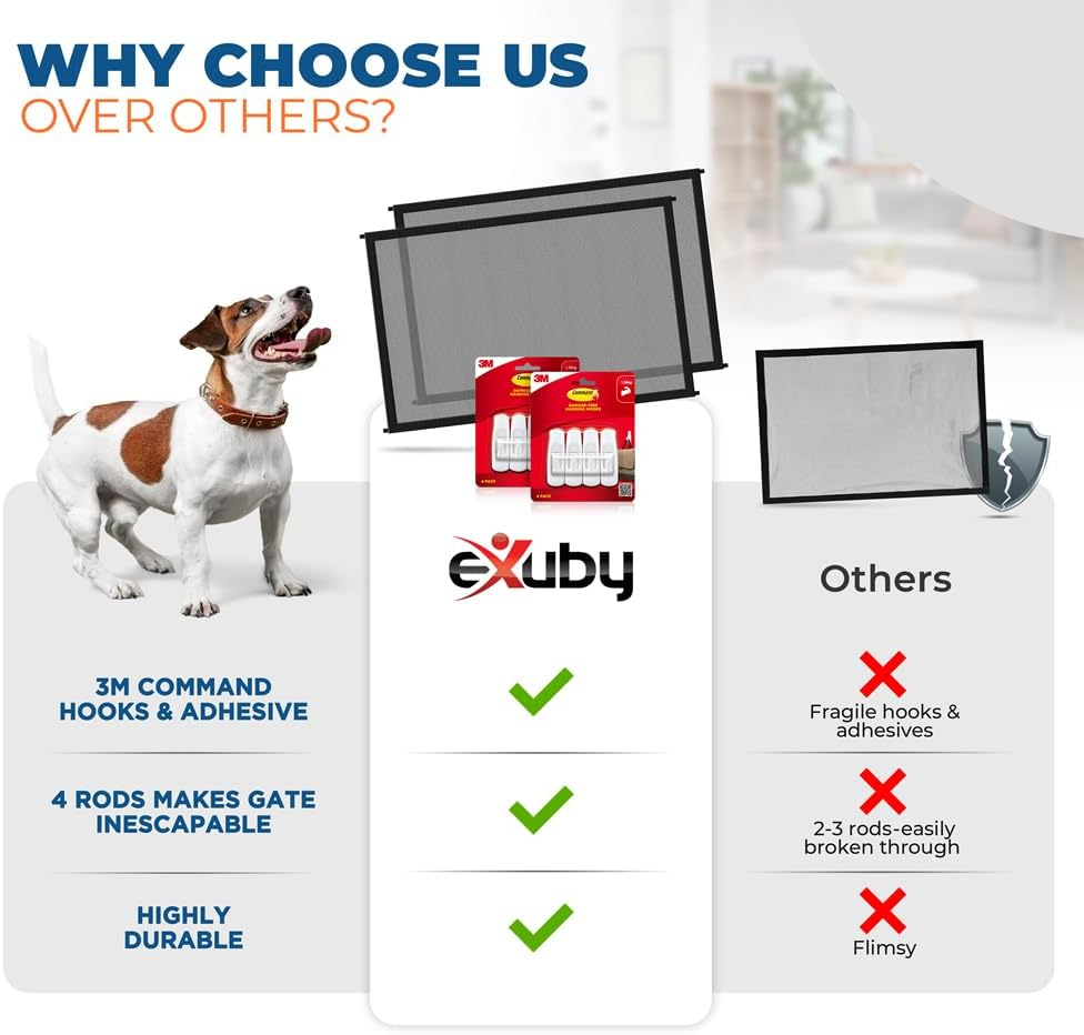 2-Pack Dog Gate for Stairs Doors W/ 3M Command Hooks Built with Extra Strong Max Effortless Containment Solution - Keep pets where they're supposed to be with our dog gate, perfect for creating boundaries at home without restricting visibility or ease of access for you. Commanding Convenience - Bundled with renowned 3M Command Hooks, our gate offers an easy, tool-free install and removal, ensuring your walls stay pristine - 8 hooks, 12 adhesive strips included. Built to Endure - Unlike flimsy alternatives, our gate boasts double stitching and extra-thick mesh, reinforced edges, and robust 1-inch thick loops for a long-lasting barrier. Simplicity in Design - Installation is a breeze. Simply attach the adhesive, fix the hooks, slot in the rods, and set the gate. No drills, no fuss, just a secure space for your dog. Enhanced Stability with Four Rods - Our innovative four-rod system offers unmatched stability, preventing any canine Houdini from making an escape, unlike the 2-3 rod gates that falter. Versatile & Multi-Use - Ideal for stairwells, doorways, or patios, this dog gate not only contains playful pups but can also be a barrier for other animals, creating a safe space across multiple environments. Introducing the eXuby Dog Gate! The ultimate solution to effortlessly maintain your pet's boundaries without sacrificing style or damaging your home. This 2-Pack set is designed with the renowned 3M Command Hooks, ensuring a damage-free installation and removal, a blessing for renters and homeowners alike. The extra-strong materials, double-stitched for durability and featuring an extra-thick mesh, ensure that this gate stands up to the most energetic of pets. No tools? No problem. The easy installation process means you'll have a secure pet barrier in minutes, all without the need for drilling or complex instructions. The eXuby Dog Gate doesn't just keep your furry friends contained; it offers peace of mind. The four-rod system is a game-changer, creating a firm barrier that pets won't push through, ensuring their safety and your sanity. And when it's time to take it down, the process is as simple and hassle-free as the setup. Dimensions: 42” Width x 31.5” Height What’s in the box? 2x eXuby Mesh Dog Gate 8x Steel Support Rods 8x 3M Command Hooks 1x User Manual Item model number EXB-DGTE1 Unit Count 2.0 Count Warranty Description 30 day manufacturer warranty. Mounting Type Pressure Mount Batteries required No Product Dimensions 42"W x 31.5"H Material Alloy Steel Item Weight 1.36 Kilograms Color Black Target Species Dog Age Range (Description) All Life Stages Specific instructions for use Boundary Included Components Mounting Hooks Complimentary Shipping and Easy Returns Need to return something? Enjoy our 30-day hassle-free return policy! Take advantage of free shipping across all 48 contiguous states! Your order will be dispatched within 1-2 business days once payment is confirmed. Your Opinion Matters! Your happiness is our main goal! We welcome your feedback! If you encounter any problems, reach out to us right away, and we’ll be here to help. Explore the Extraordinary! Our collection showcases fascinating products that are sure to capture your attention. What surprises await you? Delve in and discover unique items that enrich your daily life. Don't miss the amazing things we have in store for you!