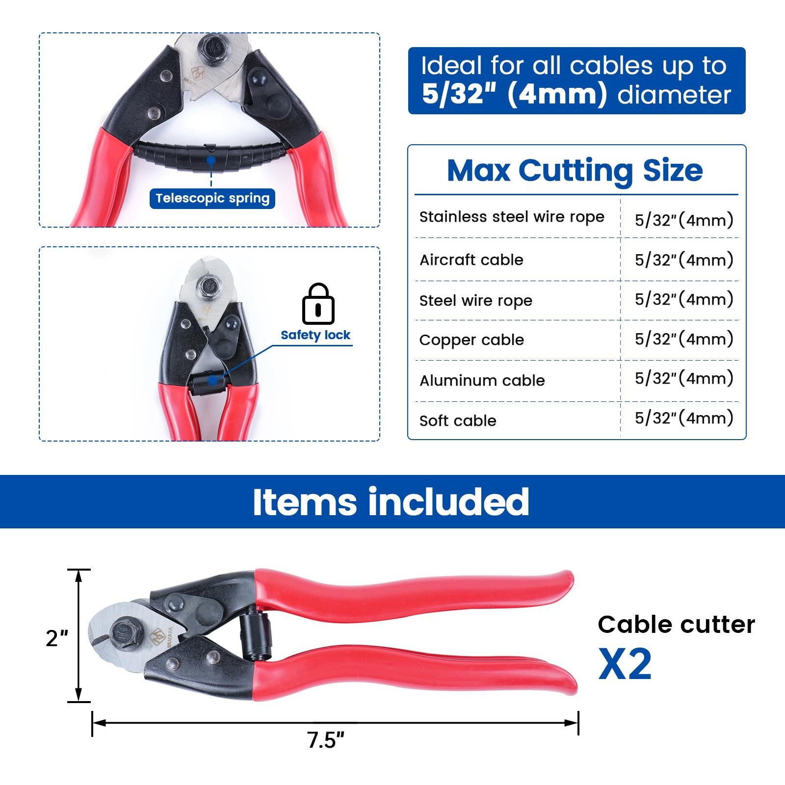 High Quality Cable Cutter - This cable cutter works excellent in cutting up to 5/32" wire rope cable of all kinds. It is widely used in industrial and home applications like cable railing, fencing, bike brakes, and other DIY projects. Recommend using with 1/8" stainless steel wire rope WR01 and hydraulic crimper CR09. Package includes: 2pcs cable cutter Clean Cut - The blade of this wire rope cutter is quite sharp and durable since the blade is made of chrome vanadium steel and has been hardened by high-frequency quenching. This steel wire cable cutter can make exact and clean cuts without fraying or smashing the cable ends Safe and Easy - The safety lock prevents accidental opens and cuts that might hurt you. The ergonomic one-hand operation and non-slip rubber grips make it work easily. With telescopic spring and lightweight design , it is beginner-friendly and portable Advice for constructing a system - To help you build a cable railing system, we recommend the following product combinations from , including cable railing kits CR23 CR07, protector sleeves CR72 CR79, angle washer CR25, adhesive grommet protector sleeve CR91, 1/8" stainless steel wire rope WR02, cable cutter CR12, Hydraulic Crimper CR09, cable railing posts PS01 PS02, handrails HT10, handrail connectors HA01 HA02 HA23 【High Quality】This cable cutter works excellent in cutting up to 5/32" wire rope cable of all kinds. It is widely used in industrial and home applications like cable railing, fencing, bike brakes, and other DIY projects. Recommend using with 1/8" stainless steel wire rope WR01 and hydraulic crimper CR09. Package includes: 2pcs cable cutter 【Clean Cut】The blade of this wire rope cutter is quite sharp and durable since the blade is made of chrome vanadium steel and has been hardened by high-frequency quenching. This steel wire cable cutter can make exact and clean cuts without fraying or smashing the cable ends 【Safe and Easy】The safety lock of these cable cutters prevents accidental opens and cuts that might hurt you. The ergonomic one-hand operation and non-slip rubber grips make it work easily. With telescopic spring and lightweight design, it is beginner-friendly and portable 【System Recommendation】To help you build Sliver cable railing system more efficiently, we recommend the following product combinations from , including cable railing kits CB40 CR07, wire rope WR02, protector sleeve CR72 CR79, angled washer CR60, cable cutter and hydraulic crimper CK12, posts PS01-LA4S PS02-LH4S L34S, handrails HT10-SL4, handrail connectors HA01 HA02 HA23 【Why Choose Us】has helped millions of families with their cable railing projects during the past years. We believe that home renovation should be easy and affordable. So we work with every effort to provide quality products and professional service, to make a reliable brand. Need professional cable railing solutions, please reach us to get Free design or After-Sales service