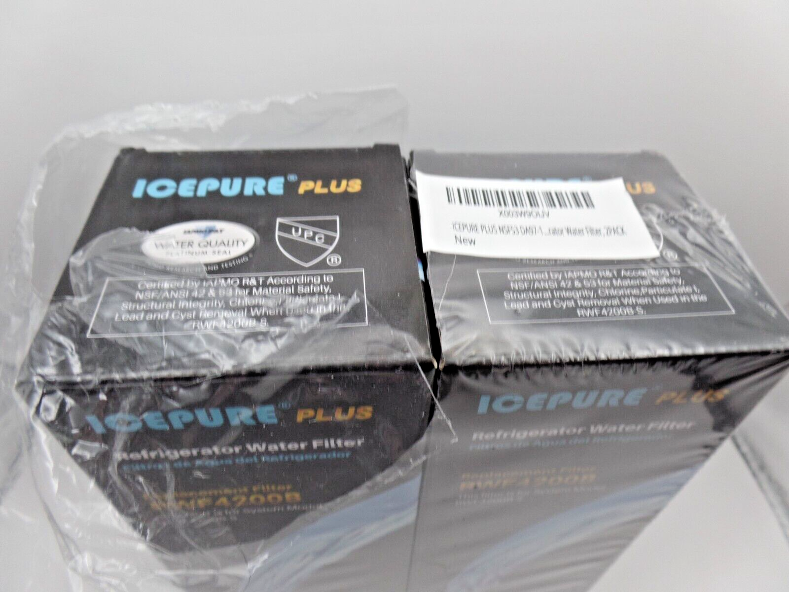 The product is a set of two IcePure RWF4200B refrigerator water filters designed for Samsung refrigerators. These filters are compatible with various Samsung models including DA97-08006C and HAF-QIN/EXP. They are made with natural coconut shell activated carbon and plastic materials, utilizing carbon/charcoal and carbon block filtration methods to remove chlorine taste and odor from drinking water. The filters are white in color and have dimensions of 7 inches in height and 3.5 inches in width. Note: One box was opened, but the filter inside was not removed and still packaged in the manufacctured seal. Please review all photos.