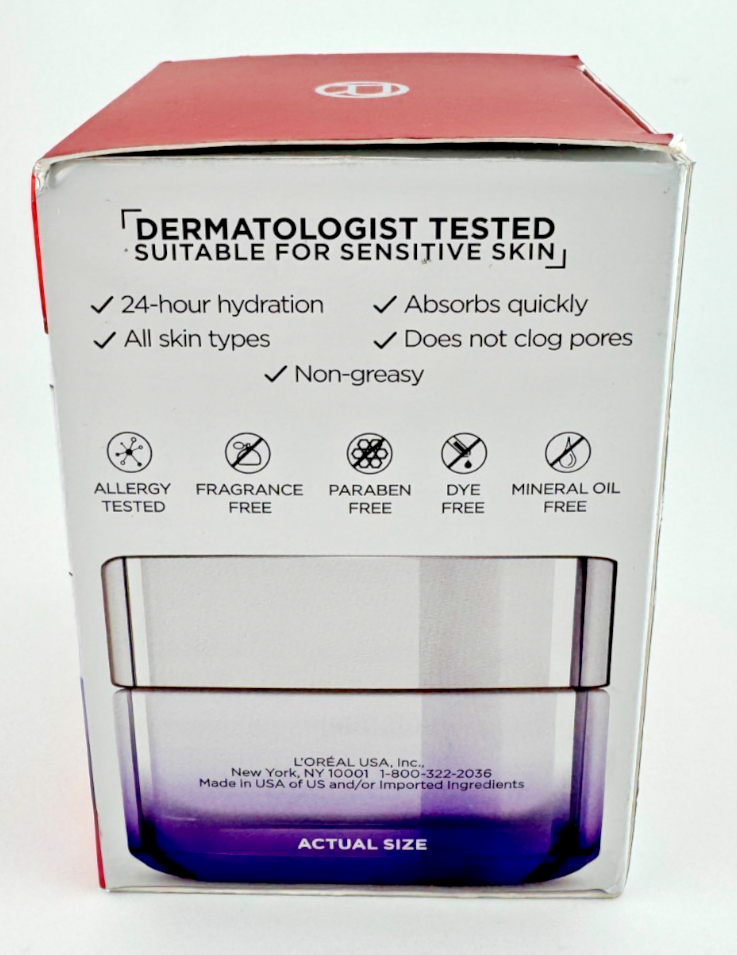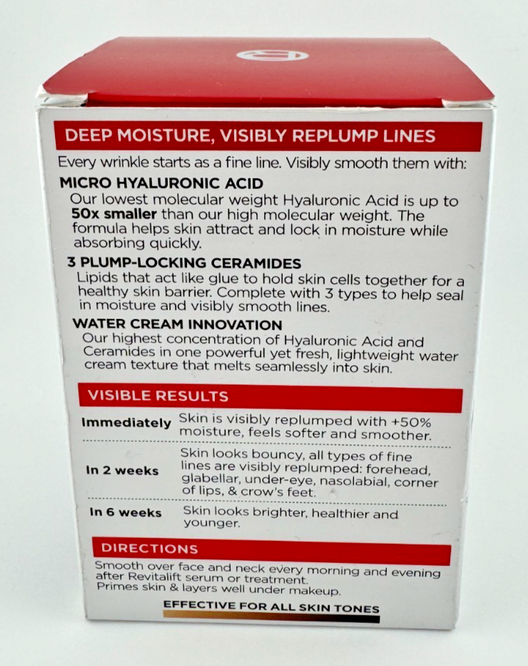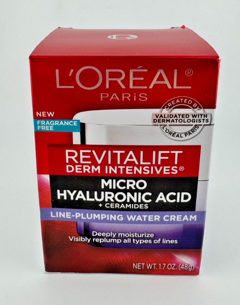 Listing Description Title: 2-Pack L’Oreal Bundle (QTY 2) Revitalift Micro Hyaluronic Acid + Ceramides Water Cream Description: Experience deep, fast-absorbing hydration with L'Oréal Paris Revitalift Derm Intensives Micro Hyaluronic Acid + Ceramides Line-Plumping Water Cream. This lightweight, fragrance-free formula delivers long-lasting moisture without greasiness. Infused with micro-hyaluronic acid, it visibly replumps the skin, while three moisture-locking ceramides help strengthen the skin barrier for a smoother, healthier look. Dermatologist-validated and suitable for all skin tones, this cream provides effective everyday hydration and skin-plumping results. How to Use: After cleansing, apply to face, neck and jawline morning and/or evening. Use after serum or treatment as needed. For best results, use consistently for 4 weeks or more—skin appears firmer and smoother. Condition: New Includes: 2 × L’Oreal Revitalift Micro Hyaluronic Acid + Ceramides Water Cream Shipping and Handling: Pack securely to prevent damage to the jar/box. Ship promptly after payment.