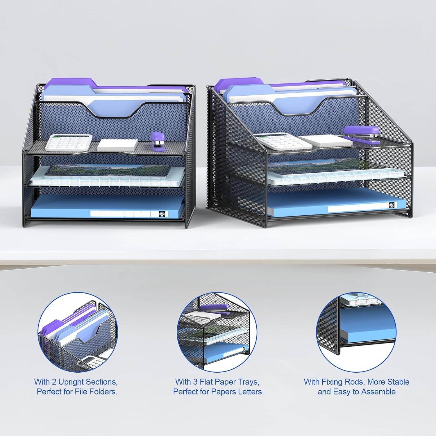 2 Pack Mesh Desk File Organizer Letter Tray Holder, Desktop File Folder Holder with 3 Paper Trays and 2 Vertical Upright Section, Black Made of sturdy metal steel mesh with smooth edge and professional black finish, more durable and stable, strong enough to hold all your files and sundries. 2 Pack three-tier paper tray and two vertical file shelves have a beautiful A4/letter size paper, documents,notepad, book, mailbox contact, files, folders and additional items such as stapler, tape, sticker, etc. Perfect for office and home use when you have too many papers but you can't throw them out because their important too. Easy to assemble with not screw the screws too tightly at first , please adjusting the balance on the table then tighten the screws ) Overall Size:12-1/4"W x 11-1/2"D x 9-1/2"H; each horizontal tray :12 x x inch(L x W x H);2 file holder:12 x x 2 inch(L x H x W)