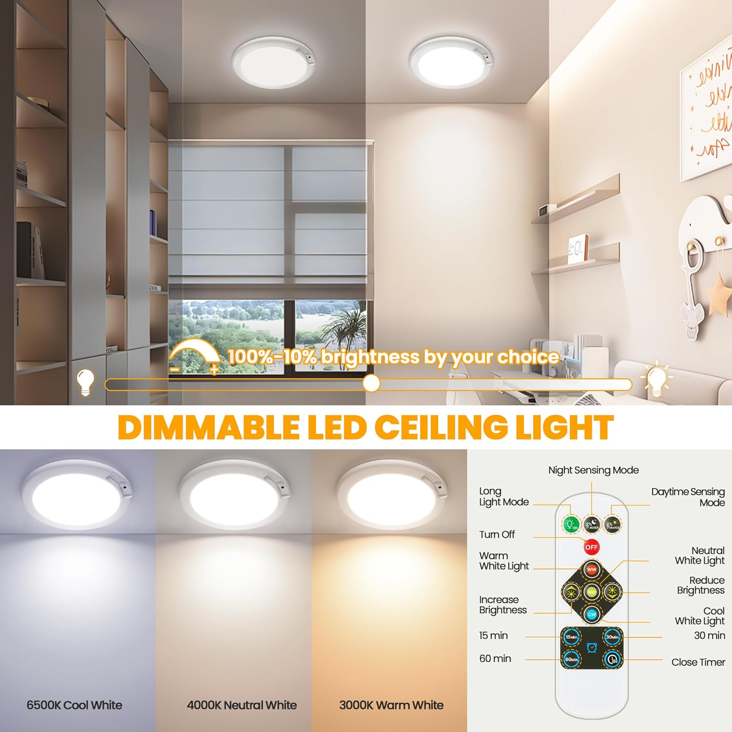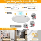No Wiring Required & Magnetic Installation: Say Goodbye to Complicated hard wired Installation. No assemble, no drill, no wiring, no socket, the led ceiling light is installed with strong magnetic suction: Only need to adhesive the iron sheet to the ceiling(no rough surface), the magnet part will be attracted to the iron sheet. It’s easy to remove the ceiling light to charge and install back to the ceiling. 3 Sensing Modes: The 2 PACK motion sensor led ceiling light with 3 sensing modes. Stay ON Mode: Battery-operated light stays on day or night, just like a regular light without motion sensing; Night Mode: Wireless closet light works in a dark environment. It only works at night and when the ambient light is below 15LUX; Anytime Mode: Motion sensor light works 24 hours. The rechargeable closet LED light will automatically light up whenever motion is detected, day or night. Built-in Rechargeable Battery Powered & Long Lifespan: No need to buy batteries to replace! Smart sensor lights built in 4000mAH rechargeable battery. The motion-detection ceiling light fixture can be used for 15 hours in the highest brightness and constant light mode, and 60 days in induction mode. 3 Color Temperatures & High Brightness: The LED closet light has three color temperatures (3000K/4000K/6500K) and multiple brightness levels (100%-10% smooth dimming); the three color temperatures can be selected on the remote control or the buttons on the light; a variety of combinations can be selected according to your needs. Smart Timer Function & Lightweight and Wide Applications: 2 Pcs remote ceiling light with 3 groups of timing: 15min/30min/60min. Perfect for dark corners and no wire positions, ultra thin flush mount close to ceiling light applies for various spaces like storage rooms, showers, garages, staircases and hallways, providing versatile cordless lighting. Product description Modern Rechargeable Motion Sensor LED Ceiling Light Battery Operated LED Light 3 Sensing Function 3 Color Temperatures Timer Function Wide Applications Bathroom, Kitchen, Basement, Powder Room, Restaurant, Bedroom, Study Room, Farmhouse, Living Room, Mudroom, Guest Room, Galley, Dining Room, Kids Room, Nursery, Utility Room, Home Office, Workshop, Shop, Office, Hallway, Entryway, Porch, Balcony, Cafe, Foyer, Mudroom, Galley, Attic, Garage Discover More Products 24W 12 Inches Flush Mount LED Ceiling light Features: 24W, Non-Dimmable, CRI 85+, 25000+ Hours Lifespan, No Flicker Color Temperature Choices: 5000K Daylight White/6000K Cool White/4000K Neutral White/3000K Warm White Semi-Flush Mount Ceiling Light, Seeded Glass Shade Applications: Hallway Porch Corridor Kitchen Bedroom Living Room Mudroom Basement Foyer Features: Seeded Glass Design Color Choices: Matte Black/Matte Brown/Oil-Robbed/Brushed Nickel/Brushed Golden 11 Watts A19 LED Light Bulbs, 100 Watt Equivalent Features: 11W, 1100 Lumens, Standard E26 Medium Screw Base, CRI 85+, 25000+ Hours Lifespan, No Flicker, Non-Dimmable Color Temperature Choices: 5000K Daylight White/2700K/3000K/4000K/6000K 4-Light Industrial Semi-Flush Mount Ceiling Lights Applications: Bedroom Living Room Hallway Porch Corridor Kitchen Basement Foyer Warehouse Features: Metal 4-light Color Choices: Matte Black/Bronze/Oil-Robbed Black/Brushed Nickel/Brushed Golden Dimmable 5CCT 12 Inches LED Ceiling light Features: 20W, 5CCT Selectable, Dimmable, CRI 85+, 30000+ Hours Lifespan, No Flicker 5CCT Selectable: 5000K Daylight White/6000K Cool White/4000K Neutral White/3000K Soft White/2700K Warm White 25W Semi Flush Mount Dimmable LED Ceiling light Features: 25W, Dimmable, CRI 85+, 50000+ Hours Lifespan, No Flicker Color Temperature Choices: 5000K Daylight White/4000KNeutral White/3000K Warm White/6500K Cool White