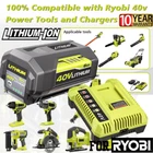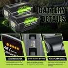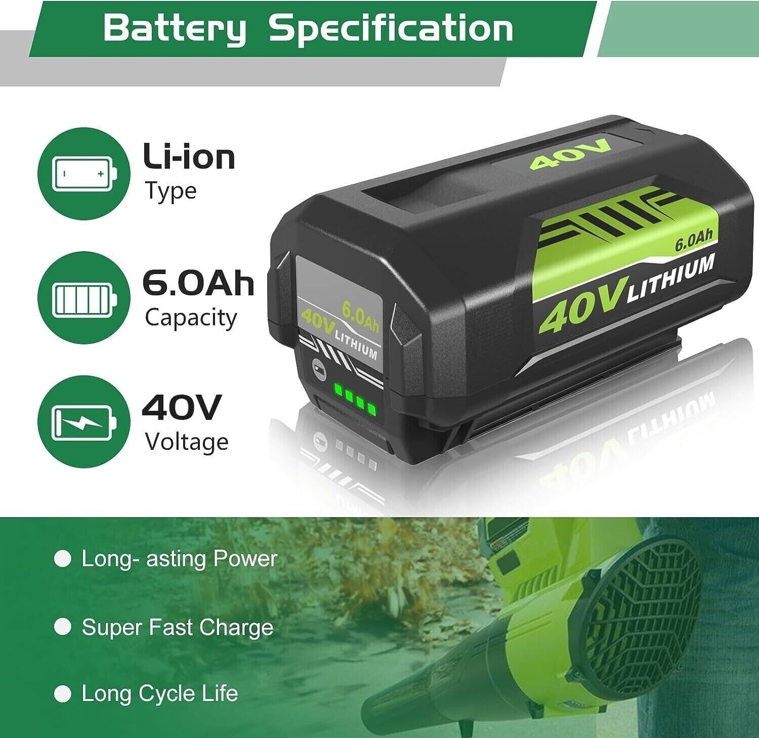 Product Features 【Battery Feature】 Replacement OEM# OP4060A: Battery Type: Lithium-ion | Voltage: 40V | Capacity: 6000mAh | Removable & Rechargeable | High capacity battery for extended run time; 【Compatible With】 This battery works with all RYOBI 40-Volt lithium-ion tools (string trimmer, lawn mower) and chargers, including RY40200 RY40403 RY40204 RY40530 RY40460 RY40180 RY40250, and OP403A OP401 ZROP401 OP400A RY40440; 【Replace Model】 for Ryobi 40V battery part#: OP4050A OP4015 OP4026 OP40201 OP40261 OP4030 OP40301 OP4040 OP40401 OP4050 OP40501 OP40601; 【LED Indicator】 On-board Battery Life Indicator: 4 LED lights on the battery that indicate the remaining power for user convenience and over-molded edges for impact protection; 【Safe & Reliable】 The lithium-ion battery is CE, FCC, ROHS certified, built-in over-charge, over-discharge, over-voltage, over-current, and over-heating protections, safety for the battery and your RYOBI 40-Volt collection. Product Specifications For battery 1.Battery Type: Lithium-ion 2.Battery Voltage: 40 Volt 3.Battery Capacity: 6000mAh 4.Battery Wattage: 240 Watts 5.Battery Color: Black and Green For charger 1.Product Type: Replacement Charger 2.Input: 90V-130V 50/60Hz 72W 3.Output: 40V 1.8A (MAX) 4.Charge Time: 3 hours or less 5.Operating Temperature: 32℉~104℉ 6.Size: 6.7*5.9*2.4 inch Compatible With Fit for Ryobi Battery Part Number:(Please use the “Ctrl+F” to search your model) OP4050A, OP4015, OP4026, OP40201, OP40261, OP4030, OP40301, OP4040, OP40401, OP4050, OP40501, OP40601 Fit for Ryobi Tools Model:(Doesn't fit RY40002, RY40503, RY40408) RY40180, RY40200, RY40022, RY40201A, RY40202, RY40204, RY40400, R40402, RY40402A, RY40403, RY40403A, RY40411, RY40502A, RY40511, RY40601A, RY40LM30, RY40190, RY40430, RY40620, RY40460, RY40250, RY40770, RY40850, RY40610A, RY40210B, RY40240, RY40440. for Ryobi 40 volt battery Fit for Ryobi Charger Model: OP400, OP400A, OP401, OP403, OP403A, OP404A, OP406A, ZROP401 Package Include Battery or Charger For Ryobi 40V (Depen on your Choice) Warranty 60 Days Free Return and 5 Year Warranty, 24 Hours friendly customer service!