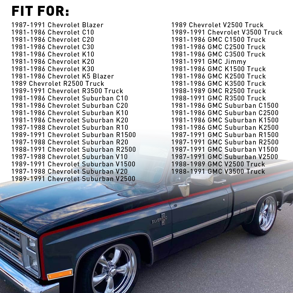 These side marker lights are a perfect fit for my '85 C10—crisp, clear, and just like OEM. Installation was a breeze, and they look fantastic. Great quality for the price, definitely recommend if you're restoring or replacing old lenses. Brightens up the truck's look instantly!
