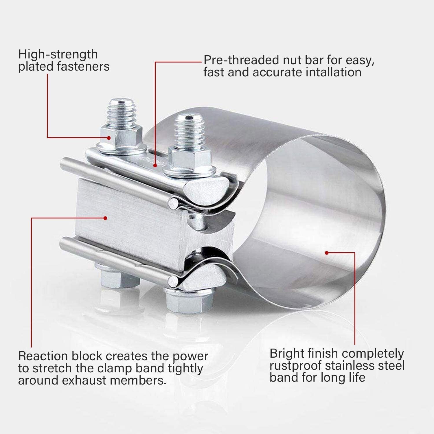 2Pcs 2.5" Inch Butt Joint Band Exhaust Clamp Sleeve Coupler T304 Stainless Steel Item Description Product Specifications: This clamp designed to connect 2.5" Outer Diameter (OD) pipes with a strap width of 3 inches (76.2mm). Broad Applications: This butt joint band clamp is an efficient solution for joining various exhaust system components and is also suitable for muffler repairs. 2 1/2" Exhaust Clamp Key Benefits: The no-weld design allows for simple installation and removal, enhancing convenience. Premium Materials: Constructed with a 304 stainless steel band, complemented by zinc-plated M10 bolts and nuts, a steel gasket, and aluminum alloy I-blocks for durability and corrosion resistance. Even Force Distribution: The clamp evenly distributes a 360-degree force, ensuring a secure seal and preventing material deformation, with a recommended torque of 63 Nm. Specifications Condition:100% Brand New Warranty: 90 Day Color: Silver Type:Exhaust Sleeve Clamp Material:Aluminium Alloy Size:2.5inch Package Included 2x 2.5" Stainless Exhaust Clamps As pictures show FAQ: I purchased by mistake, how do I cancel the order? Please contact us ASAP. If the item has not been shipped out we can cancel the order for you. If the item was shipped out you can refuse the package and wait for the item to return to us. I received your item but it does not fit or is defective Please contact us so we can assist you on the matter. Buy with confidence Our quality is based on meeting the requirements of the manufacturer and improvement them in design problems manufacture. NOTE: (1)It would be highly appreciated if you might contact us first once you have any problems concerning the items. And you can expect all the issues would be resolved ASAP! (2)Please let us know before you send us the neutral/negative feedback that wont help to finish the issues. And I will definitely try my best to provide the best solutions which would meet our satisfactory! (3)According to the distance of the receipt address items would be sent from CA or NJ