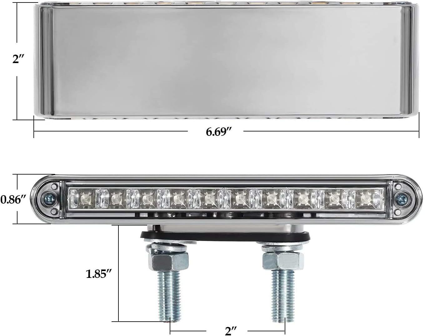Package includes 2 Pieces Chrome Plastic 20 LED 6-1/2" Double Face Trailer Light Bars. It comes with Double Metal Stud Mounts, Approx. 2" Apart. Overall Length 6-1/2". Overall Width 2". Pre-wired design and Double Metal Stud Mounts; 10 Amber LED / Clear Lens and 10 Red LED / Clear Lens. Dual Function Light Bar, Marker Light and Turn Signal: 3 Wires (Hard Wired), White Wire - Ground, Red Wire - high mode, one side lights up amber and the other side lights up red, as Turn signal light, Black Wire - low mode, as Marker/Parking; NOTE: This dual face led light can only work as turn signal only or only as parking light but not both at the same time. So if you have parking lights on. The turn signal will not work; This double faced Clear Lens amber/red pedestal LED is commonly used for additional visibility in stop/turn/tail functions in heavy and medium duty trucks; Dual-face Led Truck trailer light bars installs on your truck semi trailer fender: Amber light faces the front of trailer and Red light faces the rear of trailer. The placement is versatile; DOT compliant for street legal lighting and Fits for Kenworth Peterbilt Freightliner and other Truck lights;