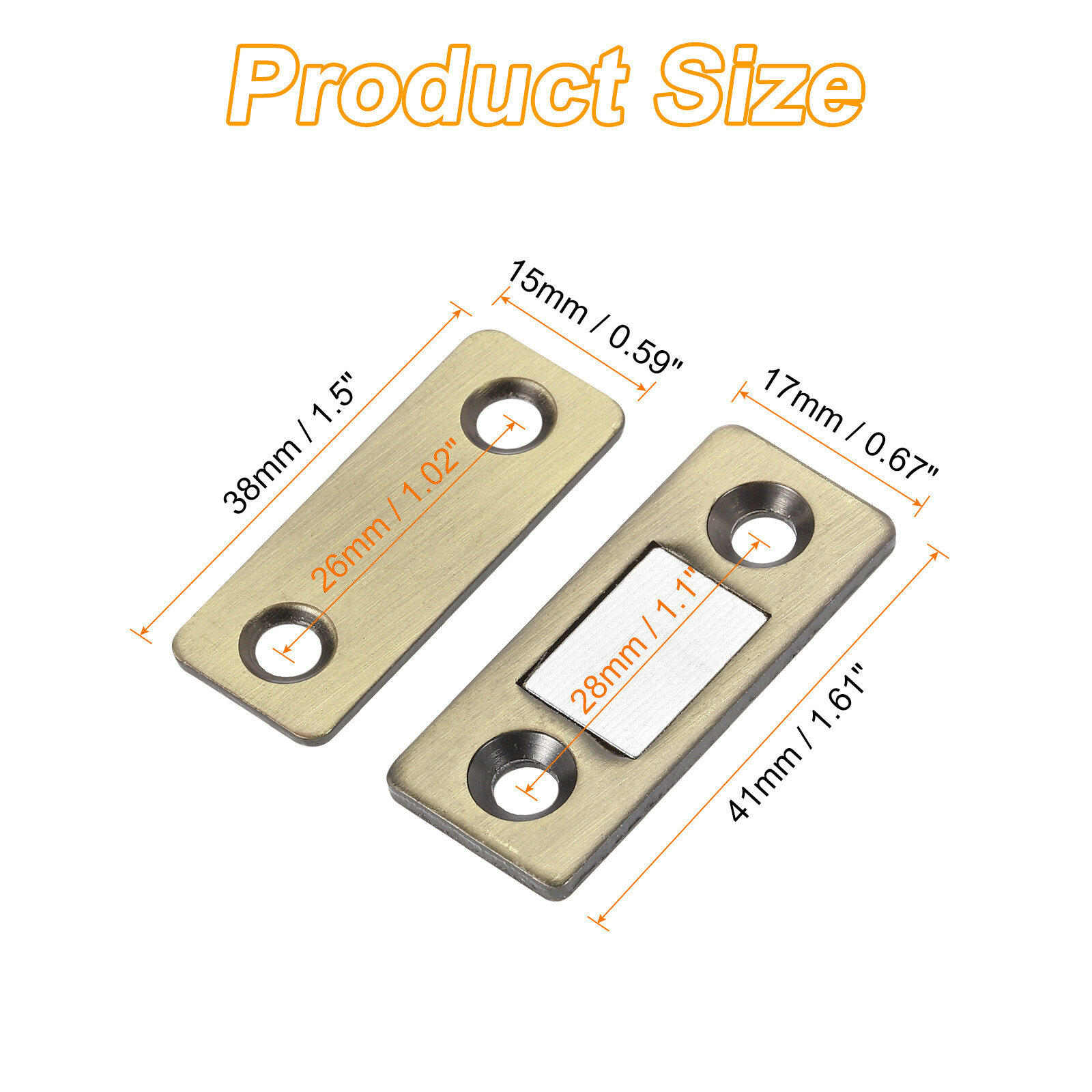 Document Description:1. Material: The cabinet magnetic catch is made of metal, with fine workmanship. It is strong and durable, not easy to rust or fade, has a long service life, and has a flexible design that is convenient and practical.2. Design: The outer shell of the magnetic drawer lock is made of stainless steel, which is not easy to rust, and the brushed treatment is more beautiful. The magnetic drawer lock is slim and beautiful, stable and durable, with magnetic attraction, long-lasting magnetism, strong load-bearing capacity, and can make the door tightly combined. The thickened screw base has greater stability and longer service life. No drilling is required, easy to install, and can be used for the opening and closing gaps of various doors or drawers, and it is not easy to have abnormal collisions.3. Easy To Use: stick on the magnetic suction on both sides and tear off the anti-sticking paper on both sides. Then align the magnetic suction and stick it on the cabinet door. Press the cabinet doors on both sides firmly so that both sides can be completely stuck. Finally, after opening the cabinet door, check whether both sides of the cabinet door are firmly stuck.4. Wide Application: Magnetic door latches are suitable for cabinet doors, furniture doors, pantry doors, french doors, sliding wardrobe doors, dressing tables, closets, cabinets, kitchen doors, drawers etc.Specifications:Color: BronzeMaterial: MetalOverall Size: 45mmx18mmx5mm / 1.77"x 0.71"x0.2" (L*W*H)Package Contents: 2Pcs x Cabinet Magnet Latch (8Pcs x Screws) 2Pcs Cabinet Magnet Latch, Adhesive Drawer Latch Magnetic Catch, Bronze Description: 1. Material: The cabinet magnetic catch is made of metal, with fine workmanship. It is strong and durable, not easy to rust or fade, has a long service life, and has a flexible design that is convenient and practical. 2. Design: The outer shell of the magnetic drawer lock is made of stainless steel, which is not easy to rust, and the brushed treatment is more beautiful. The magnetic drawer lock is slim and beautiful, stable and durable, with magnetic attraction, long-lasting magnetism, strong load-bearing capacity, and can make the door tightly combined. The thickened screw base has greater stability and longer service life. No drilling is required, easy to install, and can be used for the opening and closing gaps of various doors or drawers, and it is not easy to have abnormal collisions. 3. Easy To Use: stick on the magnetic suction on both sides and tear off the anti-sticking paper on both sides. Then align the magnetic suction and stick it on the cabinet door. Press the cabinet doors on both sides firmly so that both sides can be completely stuck. Finally, after opening the cabinet door, check whether both sides of the cabinet door are firmly stuck. 4. Wide Application: Magnetic door latches are suitable for cabinet doors, furniture doors, pantry doors, french doors, sliding wardrobe doors, dressing tables, closets, cabinets, kitchen doors, drawers etc. Specifications: Color: Bronze Material: Metal Overall Size: 45mmx18mmx5mm / 1.77"x 0.71"x0.2" (L*W*H) Package Contents: 2Pcs x Cabinet Magnet Latch (8Pcs x Screws) Hot Item Payment 1.We accept eBay payment . 2.Payment must be received within 7 business days of auction closing. Shipping 1.We ship to your eBay or Paypal address. Please make sure your eBay and Paypal address is correct before you pay. 2.Items will be shipped within 1-3 business day when we received payment. 3.Delivery time depends on destination and other factors. Description Policy 2Pcs Cabinet Magnet Latch, Adhesive Drawer Latch Magnetic Catch, Bronze Description: 1. Material: The cabinet magnetic catch is made of metal, with fine workmanship. It is strong and durable, not easy to rust or fade, has a long service life, and has a flexible design that is convenient and practical. 2. Design: The outer shell of the magnetic drawer lock is made of stainless steel, which is not easy to rust, and the brushed treatment is more beautiful. The magnetic drawer lock is slim and beautiful, stable and durable, with magnetic attraction, long-lasting magnetism, strong load-bearing capacity, and can make the door tightly combined. The thickened screw base has greater stability and longer service life. No drilling is required, easy to install, and can be used for the opening and closing gaps of various doors or drawers, and it is not easy to have abnormal collisions. 3. Easy To Use: stick on the magnetic suction on both sides and tear off the anti-sticking paper on both sides. Then align the magnetic suction and stick it on the cabinet door. Press the cabinet doors on both sides firmly so that both sides can be completely stuck. Finally, after opening the cabinet door, check whether both sides of the cabinet door are firmly stuck. 4. Wide Application: Magnetic door latches are suitable for cabinet doors, furniture doors, pantry doors, french doors, sliding wardrobe doors, dressing tables, closets, cabinets, kitchen doors, drawers etc. Specifications: Color: Bronze Material: Metal Overall Size: 45mmx18mmx5mm / 1.77"x 0.71"x0.2" (L*W*H) Package Contents: 2Pcs x Cabinet Magnet Latch (8Pcs x Screws) Hot Item Payment 1.We accept eBay payment . 2.Payment must be received within 7 business days of auction closing. Shipping 1.We ship to your eBay or Paypal address. Please make sure your eBay and Paypal address is correct before you pay. 2.Items will be shipped within 1-3 business day when we received payment. 3.Delivery time depends on destination and other factors.