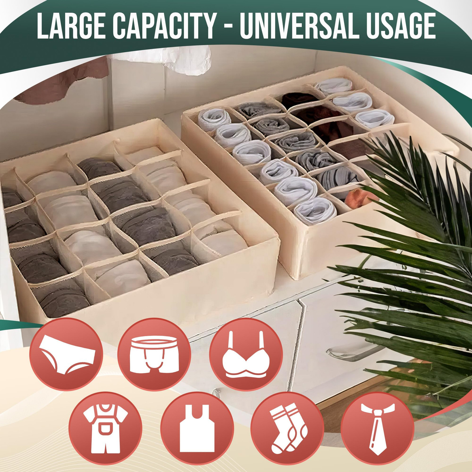 Premium Quality Drawer Organizers for Clothing: These clothes organizers and storage are made of premium and durable quality fabric and plastic board inside that is very strong enough to meet your daily requirements. Luxurious Design of Dresser Drawer Divider: These sock organizers for dresser drawers can present neat and well ordered appearance while opening your drawer or closet. This dresser drawer organizer has 24 cells, so you will get too much space. Space Saver Closet Storage Drawers: The fabric dresser organizer is perfect to save space and time on picking items from wardrobe. These closet organizers and storage can improve the utilization of your space and easy carrying to many personal storage needs. Expandable and Adjustable: Our drawer organizer for socks come in packs of 2 - One organizer with 24 compartments and one organizer with 16 compartments. Each one is measure about 3.9 inches high and 12.5x12.5 inches wide and long. Use of Drawer Sock and Underwear Organizer: Our drawer organizer socks and underwear can help you to organize your ties, scarves, t-shirt, belt organizer for men, underpants, underwear and sock organizer, baby clothes, lingerie and more accessories. Perfect as a Father's Day gift.