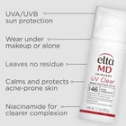 Additional Details CLEAR SUNSCREEN FOR FACE: This transparent zinc oxide sunscreen lotion is lightweight and silky, designed to blend into your skin without leaving a whitish cast or residue. ACNE SUNSCREEN: Elta MD UV Clear is an oil-free sunscreen that offers lightweight, non-greasy sun protection for acne-prone skin. TRAVEL SIZE SUNSCREEN: This travel sunscreen for face comes in a convenient 1.7 oz pump bottle. SUITABLE FOR HYPERPIGMENTED SKIN: This face sunscreen for acne, rosacea, and hyperpigmentation contains Zinc Oxide and Niacinamide to soothe skin while providing 46 SPF sun protection. WEAR ALONE OR UNDER MAKEUP: This non-comedogenic facial sunscreen is a suitable non greasy sunscreen for oily skin and can be worn on its own or under makeup. Lightweight, oil-free formulation Provides broad-spectrum protection May be worn alone or under makeup Calms and soothes skin Ideal for sensitive or acne-prone complexions