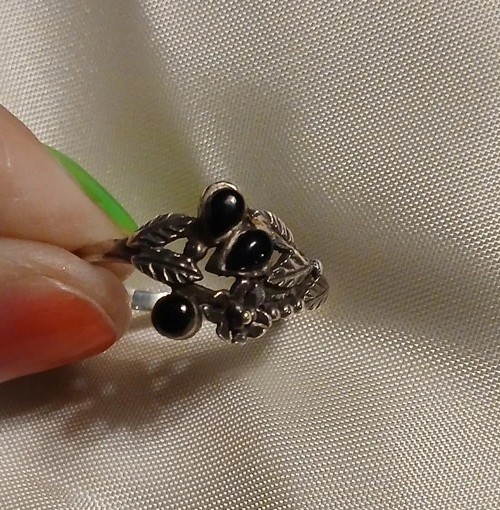Lot of 2 sterling silver onyx rings. 1 is adjustable, 1 is 8.5 mm in size. Both nature themed with leaf design adorning edges.