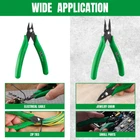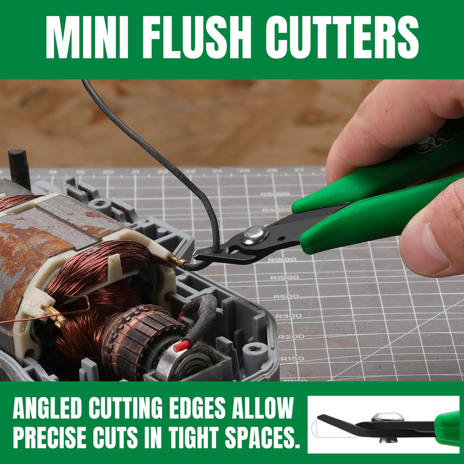 This set includes 5 inch flush cutters and 5.5 inch needle nose pliers. Crafted from high-quality Cr-Ni steel with anti-rust surface, ensures consistent performance reliable durability in different work. This set includes 5 inch flush cutters and 5.5 inch needle nose pliers. Crafted from high carbon steel with phosphating anti-rust surface, ensures consistent performance reliable durability in different work Designed to cut materials without leaving burrs (NOTICE: cannot be used for metal wires). The sharp blade and flush edge, along with the angled head, make it ideal for various electrician tasks in tight spaces Featuring a pointed tip, the mini needle nose pliers provide precise gripping and manipulation of small objects. It is very useful for tasks like bending wire and handle small components in hard-to-reach areas Ergonomic, Anti-slip grips are designed to fit the curve of the palm to reduce hand fatigue and provid more secure grip than the common cutters, even in slippery conditions This shear-cutter pliers set is capable of tackling a variety of intricate jobs, including wire cutting, jewelry making and electronic repair. It plays a crucial role in accessing tight spaces jobs