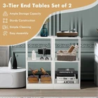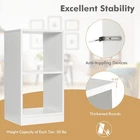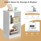 2 Cube Bookcases Set of 2, 2 Pieces Modern 2-Tier End Table Nightstand, Multifunctional Record Player Stand Cubby Storage Organizer Bookshelf for Living Room, Bedroom, 15 x 13 x 29 inches Each Product Description About this item [Ample Space for Storage & Display]: Featuring a spacious tabletop and 2 storage cubbies, the modern bookcase offers ample space for table lamp, potted plants, coffee cups, books, ornaments, and CDs. Meanwhile, the open shelves make it convenient for you to grab a book to read. [Sturdy Construction with Anti-toppling Device]: Made of 0.63” thickened boards, the 2-cube bookcase has a sturdy and long-lasting construction, being able to provide reliable support to your precious collections. In addition, there are anti-toppling device to further secure the end table for extra stability and safety. [Versatile Usage in Various Occasions]: In addition to being used as a bookshelf or record player stand to serve for your hobby, the 2 pieces of 2-tier storage units boasts endless possibilities and various applicable scenarios. For example, it can be a set of nightstands in the bedroom, or sofa end tables in the living room. [Humanized Details]: The cube storage organizer features a clean white finish as the screw holes being covered by the included stickers. Compared with other storage cubes, the unit is additionally equipped with baseboard to raise the bottom shelf from the floor in against of dust and water. And the non-slip pads somehow add to the stability. [Easy Assembly & Free Arrangement]: Comes with step-by-step instructions, the assembly of the 2-cube book cabinet is incredibly easy. Besides, each book cabinet weighs about 21 lbs/9.5 kg, which allows you to move it with ease and arrange the layout according to your preference. Description: This 2-tier end tables set of 2 are recommended for all book or record lovers! Each unit comes with 2 cubes that offer generous storage space for your favorite collections and ornaments, accenting your hobby and taste in the living space. It is also very sturdy and durable thanks to the thickened engineered wood construction. You can even mount the bookcase to the wall with the included anti-toppling kit in against of wobbling or tipping over. In addition, the minimalist design and clean white finish go well with various furnishing style. Whether in the living room, bedroom, study or office, it can will be the perfect addition that combines aesthetics and versatility. Features: Provide ample storage capacity for books, records and ornaments Made of thickened engineered wood for a long lifespan Equipped with anti-toppling device for safety concerns Comes with screw hole stickers for a safe and clean look Fitted with non-slip foot pads for stability and floor protection Smooth and waterproof surface allows for simple cleaning Modern & simplistic style can complement to your room decorations Versatile storage organizer for bedroom, living room and study Specification: Color: White Material: Engineered Wood Overall Dimension of Each Bookcase: 15” x 13” x 29”/38 x 33 x 72.5 cm (L x W x H) Dimensions of Each Cube: 14”x 13” x 12”/35 x 33 x 30 cm (L x W x H) Baseboard Height: 3”/8 cm Max. Weight Capacity of Each Tier: 50 lbs/22.5 kg Net Weight: 42 lbs/19 kg Package Includes 2 x Bookcase 1 x Instruction