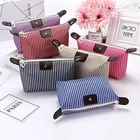 These cosmetic bags are a game-changer! The stylish striped design looks great, and the smooth zipper makes access super easy. Love that they're foldable—perfect for travel or tossing in my school bag. The waterproof nylon and leather lining keep everything safe and dry, plus they’re a breeze to clean. Super versatile—I use one for makeup and the other for tech cables and small essentials. Super practical and cute!