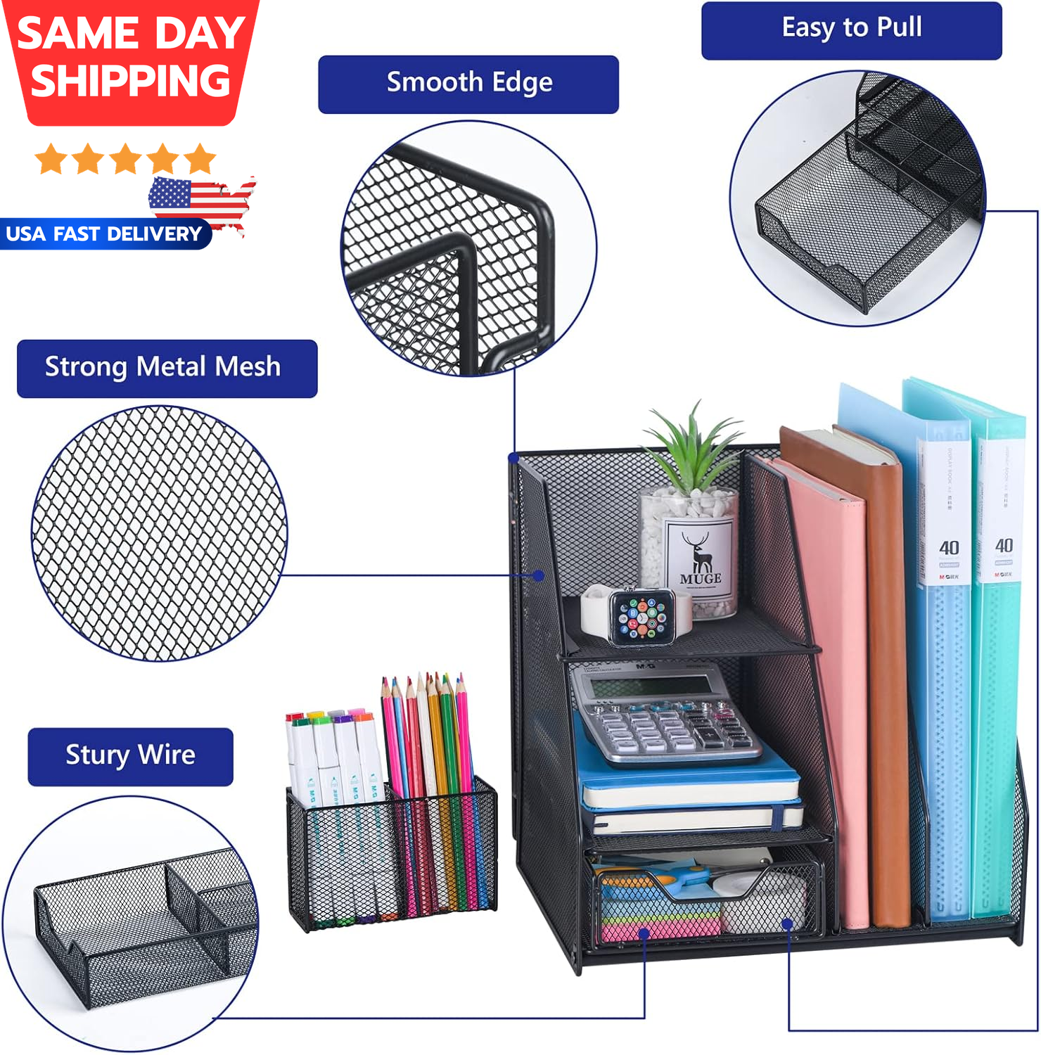 Love how this organizer keeps my desk clutter-free! The sleek black metal design looks sharp, and the two-tier trays hold papers neatly while the drawer hides small items. Pen holders are sturdy, and the mesh compartments fit everything from notebooks to sticky notes. Super sturdy—worth every penny for a clean workspace!
