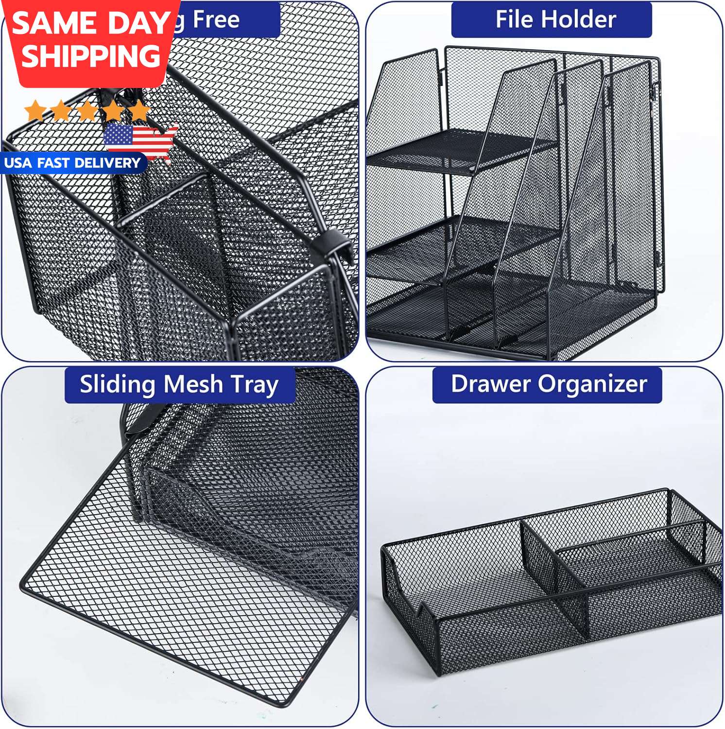 Store New Arrivals Add to Favorite View Feedback Contact Desk Organizer, File Organizer for Desk with 2-Tier Paper Letter Tray, Drawer and 2 Pen Holder, Mesh Desktop Organization with Magazine Holder for Office Supplies Description Item model number TY-DO008B-US Mounting Type Tabletop Mount Number of Compartments 6 Number of Items 1 Color Black Finish Type Powder Coated Product Dimensions 9.45"D x 9.26"W x 9.45"H Material Metal Material Type Metal Manufacturer Part Number TY-DO008B-US Maximum Weight Recommendation 5 Kilograms Specific Uses For Product Stationery Item Weight 2.59 pounds Number of Shelves 7 Special Feature Portable, Rust Resistant 【Multifunctional Desk Organizer Set】: The humanized office organizer owns 2 sliding trays + 2 Magazine Holders + 1 Hanging Pencil Holder + 1 sliding drawer ; It has enough space put kinds of desk accessories and greatly improves your work efficiency. 【Space Saving】: The paper tray organizer is very suitable for storing books, magazines, letters, and paper; The drawer organizer and hanging pen holder accommodate all office supply accessories; Helps you stay away from cluttered desks and stay organized. 【Premium Material】: The office supplies is made of lightweight durable mesh,reinforced with a solid steel frame and adopting with a powder coat finish and electroplating technolog that makes it have long-lasting strength, anti-oxidation and does not fade. 【Unique Design】: Topwey exclusive design of the all-in-one desktop organizer can be easily folded and stored to save more space, when you are not using it. 【Usage Scenario】: This organizer is suitable for office, study room, dormitory, living room, apartment and so on. It is perfect for students, teachers, employees, family members as a good assistant for organizing and storage, as a gift is also a good choice! Product Description Desk organizer/ Office supplies/ Teacher desk supplies/Back to school gifts/Desktop organizer/Work space organizer/Pen holder for desk Package Content: 1 x Desk Organizer 1 x Hanging Pencil holders 1 x Drawer Organizer 1 X Product Instruction 3 X Screws 1X screwdriver Why choose the one? · Function: File Holder, Office supplies desk organizer, Paper tray organizer, Pen holder, Drawer storage · Advantage: Larger capacity, Multiple Function, Space-Saving, Classy Look · Sturdy and Durable Metal wire mesh construction · Easy To Assemble Specifications: Material: Metal Mesh Color: Black Dimensions: 26 * 25* 26cm If you buy this desk organization, you don’t need to buy pen organizer, paper organizer, desktop drawers or pen holder. Simple and stylish office desk organizers and accessories for all your desk needs. Desk organizer is perfect integration of metal lines and mesh surface, adopting with a powder coat finish and electroplating technology. It won’t wobble or topple and last for long use. Curved corners and smooth edge design prevent your work-space surfaces safe, it’s impossible to bend or scratch with daily use. If the pen holder is placed on the side, it needs to be just right on the small dot at the adapter. LEFT TOP ALONE RIGHT Are you annoyed at searching stationery accessories in cluttered desktop?Are you looking for a versatile desk organizer that can be used on different office accessories? Our desk organizer is a must-have to make you life exquisitely, helping you organize, store, and reduce the trivial emotions of life, keep you away from the messy desktop and keep it organized. ABOUT US We offer the best prices around on high quality products. Our E-store includes media such as books, movies, music and games while offering electronics, toys, sporting apparel, clothing, tools, general home, garden items and more. SHIPPING We are always working hard to ensure your package arrives as soon as possible. Please understand that some factors like weather, high postal traffic, and the performance of shipping companies are outside of our control. We offer free shipping to the lower 48 states and ship within 1 business days of payment, usually sooner. We do not accept P.O. Boxes. Please provide a physical address. For shipping outside of the continental USA, we only use eBay's Global Shipping Program.The item is shipped to KY and then sent to the rest of the world. International customers are responsible for all duties and taxes. Continue to check out in order to calculate costs for shipping the item to your country. Messages regarding eBay's Global Shipping Program MUST be directed at eBay EXCLUSIVELY. RETURNS We offer a 30-Day Return Policy on items which you are not completely satisfied with. You have the option for a full-refund or an exchange of the item. No returns are available on items shipped outside of the USA. PAYMENT We accept PayPal. CONTACT US This page content is yet to come Please ad us to your favorite seller and visit again later Thank You CUSTOMER SATISFACTION We try our very best to make sure every customer is completely satisfied. If there's a problem, message us! We're happy to help. WE ACCEPT
