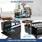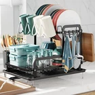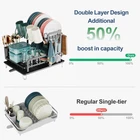 iSPECLE Dish Drying Rack with Drainboard - 2 Tier Dish Racks for Kitchen Counter with Cup Holder, Rust-Resistant Dish Drainer with Utility Hooks, Utensil Holder and Cutting Board Holder, Black 【Satisfying 1~4 People Daily Storage】iSPECLE 2-tier kitchen dish drying rack surpasses single-tier by offering 50% more capacity in the lower tier for salad bowls, extra cups, and other dishware. There are 10 dish slots (accommodating dish sizes 7.5"~10.5"), cup holders, a utensil holder, a cutting board holder, and 4 hooks 【Upgraded Utensil Holder】Our utensil holder of this dish rack is specially designed with a drain outlet, making it can be hung outside the dish rack, directs water straight into the drip tray, keeps the countertop dry. The space freed up from utensil holder can accommodate 3 additional cups 【Efficient Cup & Cutting Board Storage】The cup holders are connected to the dish slots, and the cutting board holder is secured to the side of the dish racks for kitchen counter, the smart organization does not occupy valuable space within the rack, 3~4 more cups and a cutting board can be put on the dish drainer 【Effective Self-Draining Function】With the extra high feet on the tray, the dish drying rack with drainboard accommodates most raised sinks. The 360° rotatable, extendable drainage pipe of this black dish drying rack allows easy adjustment based on your sink's position, keeps your kitchen countertop dry and neat 【Sturdy & Rust-resistant】We've strengthened the upper plate slots with screws for greater stability in this dish dryer rack. This dish holder is made of premium metal and coated with rust-proof coating, making the dishes drying rack more durable. Size: 16.5 4"L x 14.57"W x 12.99"H