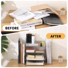 4 Layers Office Organization: Our office organization and storage has 4 trays and 2 Vertical file holders that can be used to display your items or store savings, such as A4 paper, documents, Magazines, Binders, books, notebooks, notepads, stationery, pens, keys, jewelry, etc., providing you with a lot of convenience. Stylish and Sturdy Desk Organizer: Our paper letter tray is made of thick premium PET material, which features durable and sturdy to use for a long time. The transparent office storage looks very clean and sleek, and it can provide a clean/organized look of your home and office desk for you. Space Saveing: With a stackable and vertical design, this desk organizer tray takes up a small space in your office desk, but provides you with a large storage space. This clear office folder holder for desk can keep all your stuff in one place. It will nicely to sort and hold your office supply and desk accessories. Multiple Functional: This horizontal stackable desk organizers and storage is great for school, home, and office to organize textbooks, notebooks, teachers' and students' files, documents, magazines, stationery, printer paper, pencils, etc. 100% Satisfaction Guaranty: Customer satisfaction is on our top priority. If there have quality and transport damage problems with the office desk organizer, contact us, we will do best to offer a satisfactory solution for you within 24 hours.