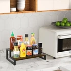 Spice Rack Organizer for Countertop, 2 Tier Kitchen Counter Shelf, Wooden Tiered Display Stand Riser Shelf Vintage Appearance: Spice rack organizer for cabinet have rustic and aesthetic wood grain that fits perfectly with the black matt paint. Simple and elegant dark brown, adding a vintage rustic feel to your home. This rack is suitable for many places in your home. Sturdy Construction: The seasoning organizer made of high quality heavy-duty particleboard and supported with iron legs. Thickened iron frame (Thickness of 0.6 inch) to ensure sturdiness and has a stronger bearing capacity. The high-quality particleboard provides a flat & smooth surface can efficiently resist the corruption from water and easy to be cleaned. Convenient Design: The size of this spice organizer: 15.8”L x 8.5”W x 5.2”H. The stepped design allows your spice bottles, jars, coffee syrup bottles, condiments and spices to be clearly classified and fully displayed, you can find them quickly when you need them while cooking, avoiding panic. Multifunctional Usage: The desktop shelf can be used to condiments, coffee syrup bottles, spices, cans and kitchen supplies in the kitchen ; It can be used for books and decorations in the study; It can be used to bath towels, lotions, cosmetics, moisturizers, nail polish, soap and shampoo in the bathroom. No exaggeration, it can be applied to any corner of the house. Quick Setup & Easy Cleaning: With detailed instructions and tools provided, you can have this 2-tier spice rack assembled in 10 minutes. The wooden surface is waterproof and dust free, a damp cloth could keep the spice rack clean.