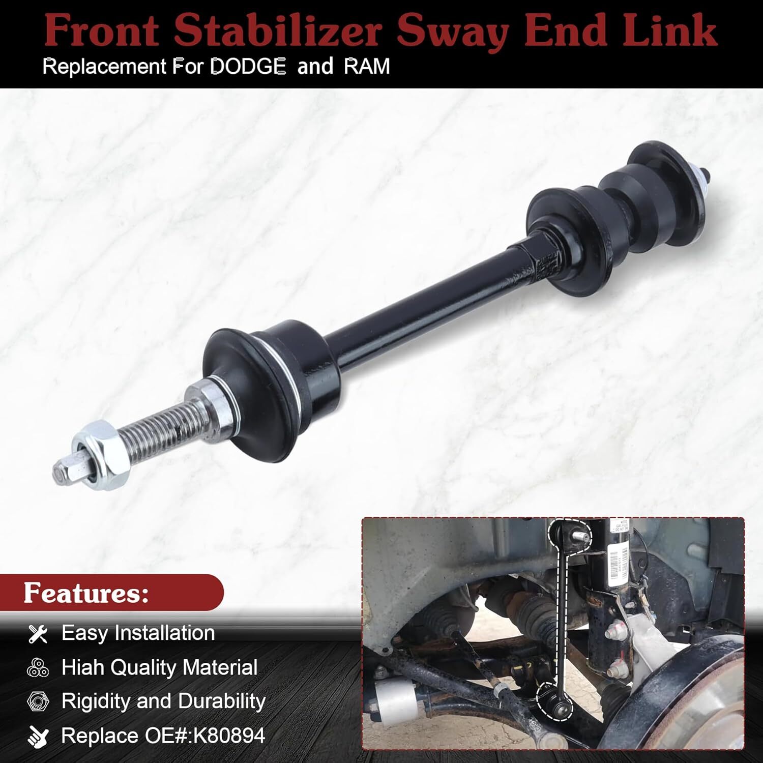 About this item 【Fitment】Sway Bar Link compatible with DODGE RAM 1500 2006-2010丨DODGE RAM 2500/3500 2003-2010 丨RAM 1500 2011-2019丨RAM 2500 2011-2014丨RAM 3500 2011-2012丨RAM 1500 CLASSIC 2019-2021 【Replacement part number】Front Stabilizer End Link Rerlaces#K80894 【High Quality】We aim to be the best quality Sway Bar End Links manufacturer. All of our products use the highest quality raw materials.We have the advanced laboratory equipment to test products. The quality can completely replace OE Parts. 【Better experience】There are several benefits that can be gained from a timely replacement of the sway bar end link:1.Improved handling,making the vehicle more stable and easier to control, especially during cornering.2.Better stability: making the ride smoother and more comfortable.3.Quieter ride: reduce noise and vibration, making the ride quieter and more pleasant. 【Excellent after-sales service】We All our customers enjoy Lifetime Money Back Guarantee.Customers can return and get refund in case the purchasing is not satisfactory for any reason. We offers 24 hours quick-reply and friendly customer service.Thank you for your support. Kit Includes: 2x Front Stabilizer / Sway Bar End Links - K80894 Fits 5-lug Only FITS: MAKE MODEL YEAR RANGE SPECIFIC DETAILS DODGE RAM 1500 2006 - 2010 4x4 / 4WD Models ONLY DODGE RAM 2500 2003 - 2010 2WD Models ONLY DODGE RAM 3500 2003 - 2010 2WD Models ONLY RAM 1500 2011 - 2012 4x4 / 4WD Models ONLY RAM 1500 2013 - 2019 All Models RAM 2500 2011 - 2014 2WD Models ONLY RAM 3500 2011 - 2012 2WD Models ONLY RAM 1500 CLASSIC 2019 - 2021 All Models
