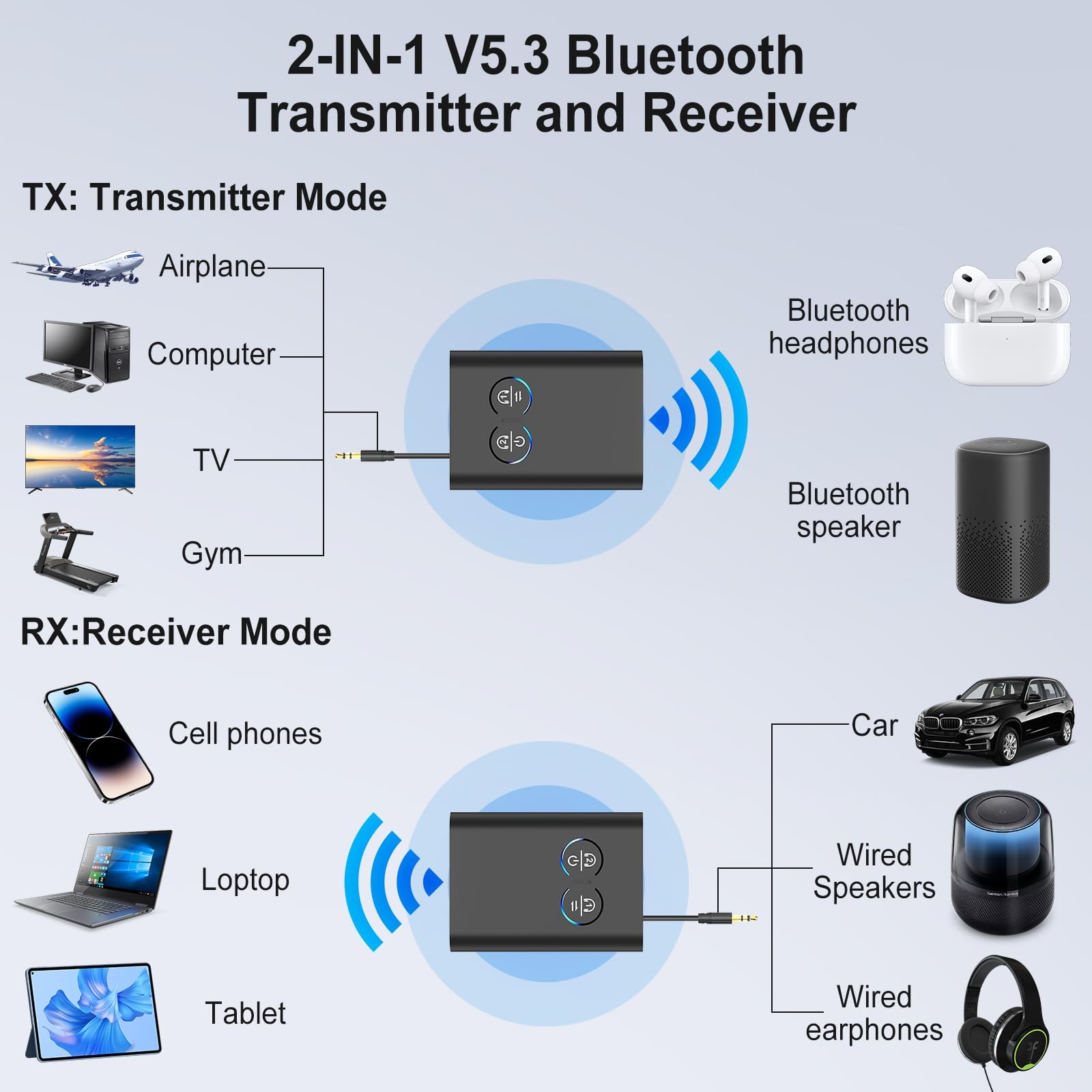 Bluetooth Transmitter Receiver for Airplane, 2 in 1 Airplane Bluetooth 5.3 Adapter for Flight Supports to 2 AirPods/Headphones Bluetooth Transmitter for TV, Car, Gym, Home Stereo Dual Mode Made Simple. Receiver mode & Transmitter mode Bluetooth 5.3 version. Easily stream wireless audio from in-flight. Low latency and offer a fast and stable transmission. Auto reconnects - No more annoying dropouts during workouts! HiFi sound quality and stable transmission. It works with any device that outputs audio (such as planes, TVs, gym equipment, etc.) And it can connect to Bluetooth headphones or earbuds. Dual link. This bluetooth transmitter can be paired with two wireless headphones at the same time in TX mode. You can share and enjoy music and audio at the same time with your friends and families. Tech You Can Trust: FCC/CE Certified - Safe for planes (adapter included!) and daily use 25-hour battery - Lasts through 2 movies Real People Use It For: Gym: Connect wired headphones to Peloton/iPad Work: Take Zoom calls on noise-canceling headphones Travel: Watch movies on planes without crappy airline headphones Package Includes: 1 x Bluetooth 5.3 Transmitter Receiver 1 x Transmitter 1 x User Manual 1 x UsB Type C Charging Cable(for Charging and connect devices) Audio Cable 1 x Dual 3.5mm Maleto Female Adapter 【WIDE COMPATIBILITY 】Our Bluetooth 5.3 Transmitter for airplane easily stream wireless audio from in-flight. It works with device which outputs audio (such as planes, TVs, gym equipment, etc.) and can connect to any and all Bluetooth headphones or earbuds. Equip 3.5mm cable and male to female adapter for any flights. 【Dual Mode Made Simple 】 Receiver mode (for wired speakers, Car, Wired earphones) , Transmitter mode (for wired Airplane, TV, Computer, Gym) - No app needed! 【HiFi Sound Quality】 Bluetooth adapter built with bluetooth 5.3 technology. Low latency and offer a fast and stable transmission. 【Dual Link】This bluetooth transmitter can be paired with two wireless headphones at the same time in TX mode. You can share and enjoy music and audio at the same time. 【Long Battery Life】 Enjoy up to 25 hours of continuous use on a single charge. The Type-C fast charging gets you back to full power in 3 hours and 90 days standby time. Simple Setup and the dual connect ports USB or 3.5mm audio devices can be use simultaneously.