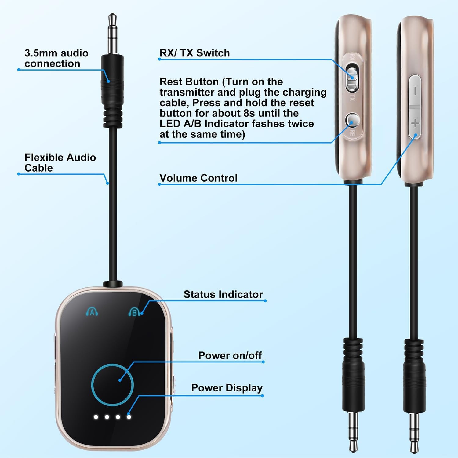 Compact and portable, with long battery life: The Bluetooth AUX adapter takes up very little space, so you can take it anywhere. Built in rechargeable lithium battery, USB C fast charging, fully charged within 1-2 hours. It can operate for about 13.5 hours in RX mode and 11 hours in TX mode. The AUX adapter can be used during charging, which is very convenient. 2-in-1 Bluetooth Transmitter Receiver: In TX mode, the Bluetooth transmitter allows you to transmit audio from your TV, PC, or airplane entertainment system to Bluetooth headphones, earplugs, and Bluetooth speakers via a 3.5mm cable. In RX mode, the Bluetooth receiver allows you to wirelessly connect your smartphone to wired speakers, headphones, car speakers, or home speakers via Bluetooth. Includes an additional dual 3.5mm AUX adapter to enhance compatibility with various aircraft audio interfaces. Convenient Setup and Quick Pairing: This Bluetooth AUX adapter can connect two devices simultaneously in RX/TX mode, allowing you to enjoy music without affecting others. It has automatic connection memory feature, just enable Bluetooth again after the first successful pairing to automatically connect with your phone. To pair with different devices, simply press the reset button. We suggest turning off other Bluetooth devices (such as mobile phones) around during the pairing process to avoid interference. Bluetooth 5.3 Easy Setup: This Bluetooth transmitter receiver uses Bluetooth 5.3 technology, which has a 10 meter range and low latency, ensuring uninterrupted high-quality audio even in signal interference environments. Whether used as a transmitter or receiver, it ensures a consistently excellent audio experience. In addition, the 3.5mm auxiliary audio jack can help you easily connect the adapter to various audio devices. Universal and Seamless Connectivity: Enjoy strong compatibility with our wireless Bluetooth transmitter and receiver. Equipped with a range of adapters, including dual plug airplane adapters and 3.5mm audio jack converters, it effortlessly adapts to your needs. Regardless of different aircraft model preferences or wired headphone reception, our devices ensure that you always stay connected, just plug in and enjoy uninterrupted entertainment. Unique Metal Material: Using metal frame material, exuding delicacy and durability. Its smooth metal structure not only enhances its aesthetic appeal, but also ensures elasticity against wear. The metal frame adds a touch of elegance to any audio setting, making the airplane Bluetooth transmitter a stylish and reliable accessory that enhances the audio experience. Please note: That after receiving the product please charge the product for a sufficient period of time as the product may lose its charge in transit.The charging standard of the product is 5V1A. Do not use a high current adapter to charge the product.Please must quickly recharge with the included Type-C cable, so you can keep enjoying your music and calls.