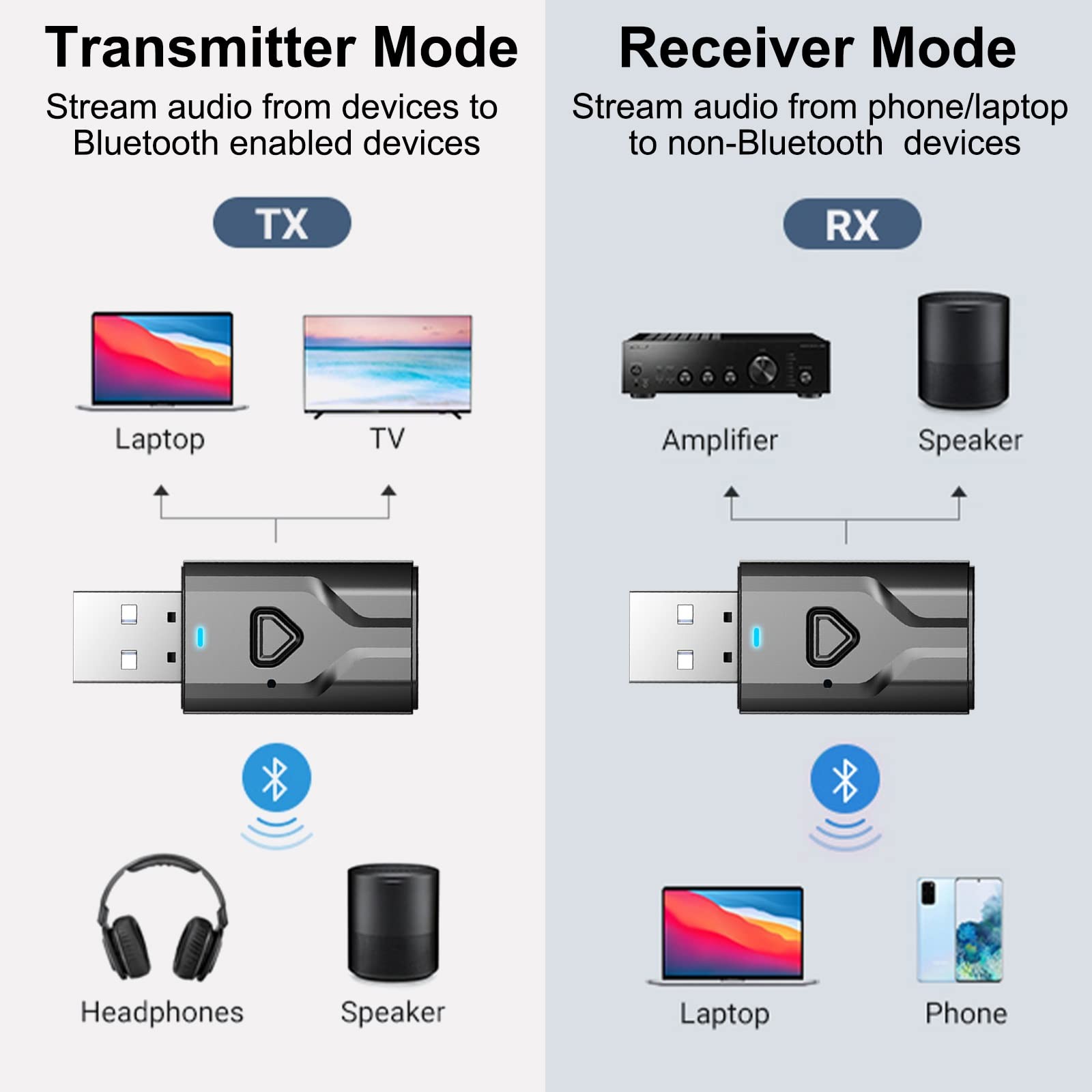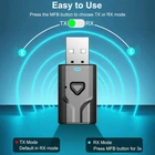Bluetooth audio transceiver supports transmitter and receiver mode In TX mode, you can plug it into a non-Bluetooth TV, PC, gym/flight equipment to transmit audo to your Bluetotoh headphoens/earbuds. This adapter is also a great fix to replace the earbuds the airlines give. In RX mode, you can plug it into older car stereo or speaker system and pair with your phone to stream music wirelessly. Low Latency Upgrade non-smart/non-Bluetooth TV to pair bluetooth headphones for enhancing your hearing or get an undisturbed personal space. You can watch TV/movies/late night shows in the best sync. Hansfree calling with safe drive Built-in with microphone, Bluetooth USB adapter allows you to enjoy phone calls with hands-free calling straight through the car's speakers. Just a simple click to answer/end the call. Add bluetooth to you car Stream your phone music to your car stereo, the audio quality is top notch. Lightweight Portable Bluetooth usb transmitter only weights at 5g, it's super light and small size make it very easy to use ,only taking a little space. Power by USB Driven by USB port, no built in battery but forever power. Never worry about charging problem or broken battery. Our bluetooth USB adapter ensures constant streaming and always reliable power. Easy to Use The button design allows you to use it conveniently and quickly, just press the middle button for 3s to switch Mode TX/RX. Red light for TX, Blue light for RX. Bluetooth 5.0 3.5mm AUX adapter adopts Bluetooth 5.0 technology for more efficient stable connection, faster transmission and wider signal range, giving you a wonderful audio experience up to 10 Meters. Specification Bluetooth version: 5.0 Small size: Space-saving & mobile Interface: 3.5mm+USB Port Long range: Stream audio over longer distances Stream while charging: Enjoy uninterrupted music One-button control: One button to switch between TX and RX mode. Item size: 45x20x10mm;Weight: 5g Package 1 x Bluetooth Transmitter Receiver; 1 x 3.5mm Audio Cable(50cm); 1 x User Manual Bluetooth Transmitter Receiver: Portable Bluetooth adapter can used as either transmitter or receiver. In TX mode, It is plugged into non-Bluetooth devices such as TVs, PCs , Airplane Entertainment and transmits audio to Bluetooth headphones/speakers; in RX mode, it can be connected to older car stereo or speaker system and stream music from smartphones or tablet through the 3.5mm stereo jack. Low Latency: Low Latency technology eliminate audio delay, so you can watch TV / Movie / Video / Gaming in perfect video audio synchronization so that get an undisturbed personal space or without distubing others. Stable Fast Connection: With Bluetooth 5.0 technology, USB Bluetooth transmitter for tv reduce power consumption and offer fast & stable 10M transmission connection without delay. Hands-Free Calling: The 3.5mm Bluetooth adapter solves the inconvenience of making a call, with with a built-in microphone can allows you to enjoy phone calls with hands-free calling straight through the car's speakers. Portable Design: The Bluetooth usb adapter is very small, lightweight and easy to carry. The bluetooth USB transmitter will automatically connect with your last paired device. USB Power Supply: Charge it on the USB port and connect it to your audio device via 3.5mm aux audio cable(included) while using, never worry it will run out of power while listening to music.