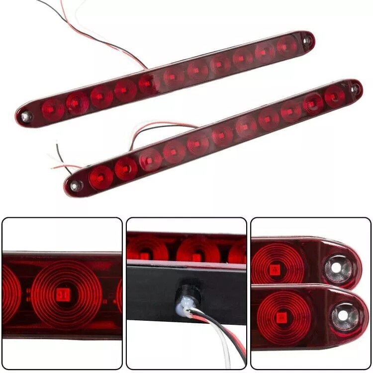 2pcs 16" Red 11 LED Trailer Truck Light Bar Stop Turn Tail Rear Brake Lamp Strip US STOCK, SHIP IN 1 BUSINESS DAY!!! Description 100% Brand New Color: Red Light Color: Red Size: L 15-3/4 (in) * W 2-3/4 (in) Voltage: 12V Hole Center to Center is 14-1/2 Feature Each light has 11 Super Diodes for a bright performance. Comes with a polycarbonate lens with all weather housing for durability. Super bright LED Surface Mount 16" light bar, completely sealed & waterproof. Package 2x 16 inch 11 LED Red stop, turn, tail and brake light bar