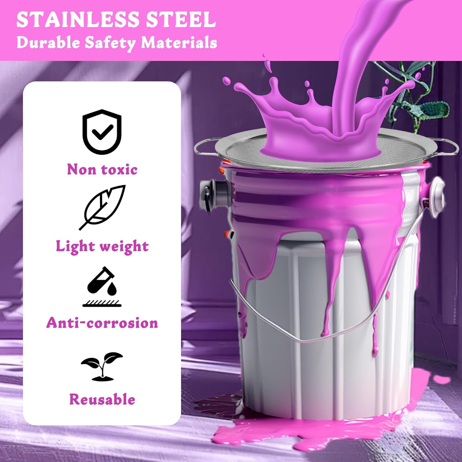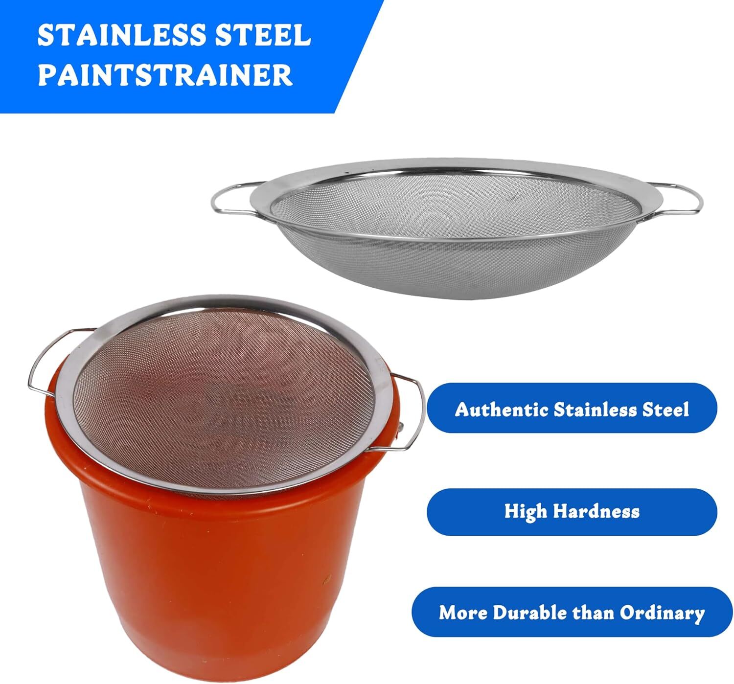 2pcs Stainless Steel Fine Mesh Paint Strainer 2pcs, Sliver Product Details Brand: ZXFUTURE Color: Sliver Material: Metal Item Weight: 16 ounces Product Dimensions: 12"L x 12"W x 4"H Capacity: 5 Gallons Handle Material: Stainless Steel Shape: Round Item Diameter: 12 Inches With Lid: No Manufacturer: zxfuture Special Feature: superior filtration Package Information: Strainer Item Weight: 1 pounds Country of Origin: China Item model number: Paint Strainer 002 2. Superior Filtration: Our fine mesh sieve fits a 5-gallon bucket perfectly, and the ultra-fine 60-mesh strainer provides exceptional filtration. It captures even the smallest impurities in your paint, preventing clogs and damage to your spray gun for a flawless finish every time, regardless of the paint type. 3. Versatile and Durable: Our strainer's fine mesh is designed for a variety of applications, including glaze, paste, paints, biodiesel, methoxide, gasoline, kerosene, and engine coolant. The robust construction allows for repeated use without losing effectiveness, making it an essential tool for various projects. 4. Effortless Cleaning and Maintenance: With our easy-to-use fine mesh strainer, simply place it on the bucket edge and pour the paint. Cleaning is a breeze; just wash with soap and water, then store in a dry place for the next use, ensuring your mesh strainer is always ready for action. 5.Enhance Your Workflow: Our paint strainer not only saves time by allowing quick pouring of paint but also ensures a smooth, grain-free finish with its fine mesh sieve. This efficiency translates to faster project completion and a more enjoyable painting experience, whether for professional or DIY projects.