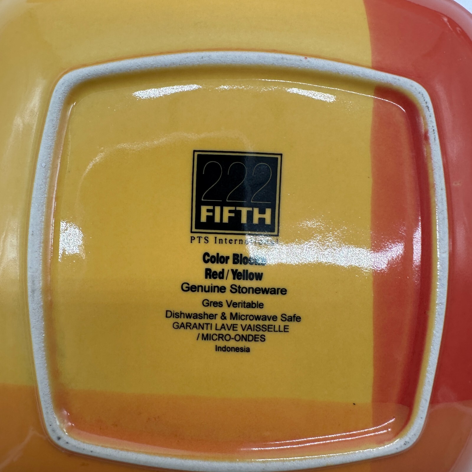 The product is a set of 3 square Salad plates from the brand 222 Fifth, featuring a Color Blocks pattern in shades of yellow, orange, and red. The plates are made of ceramic and are designed to add a vibrant touch to your table setting. Each measure at 8 7/8 inches in diameter In great like new shape More of this pattern available in my listings
