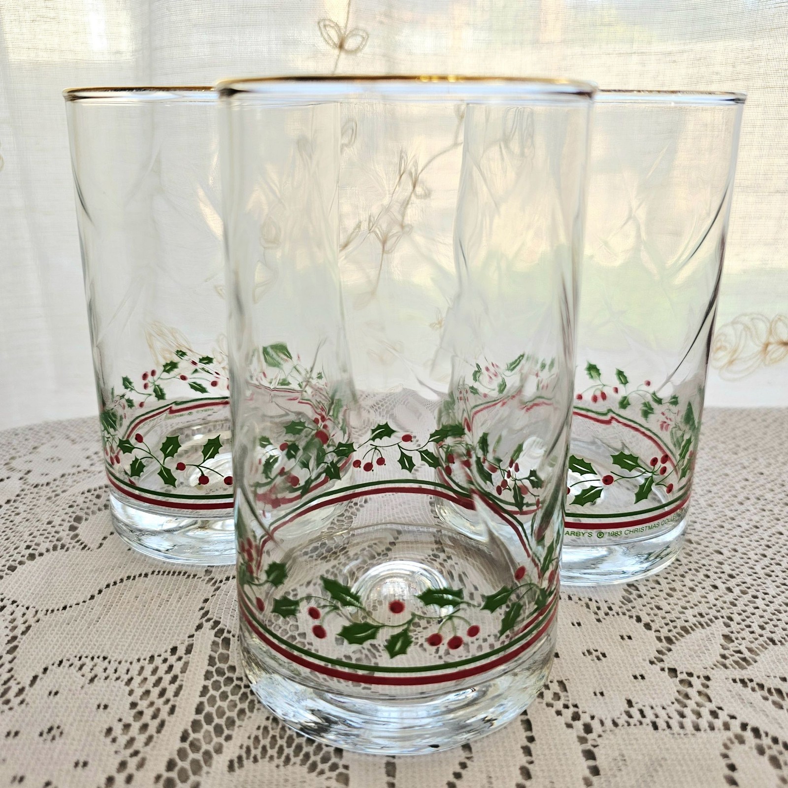 Libbey Arbys Christmas Holly Berry Glasses - 5-1/4 inch tall x 2-3/4 inch wide - Arby'S, Red/Green Holly, Gold rim - Discontinued circa: 1983 - ***Good preowned condition with no chips, cracks or fogginess. The gold trim has wear. See pictures - Double boxed for safe shipping Size: " Condition: Pre-Owned Good