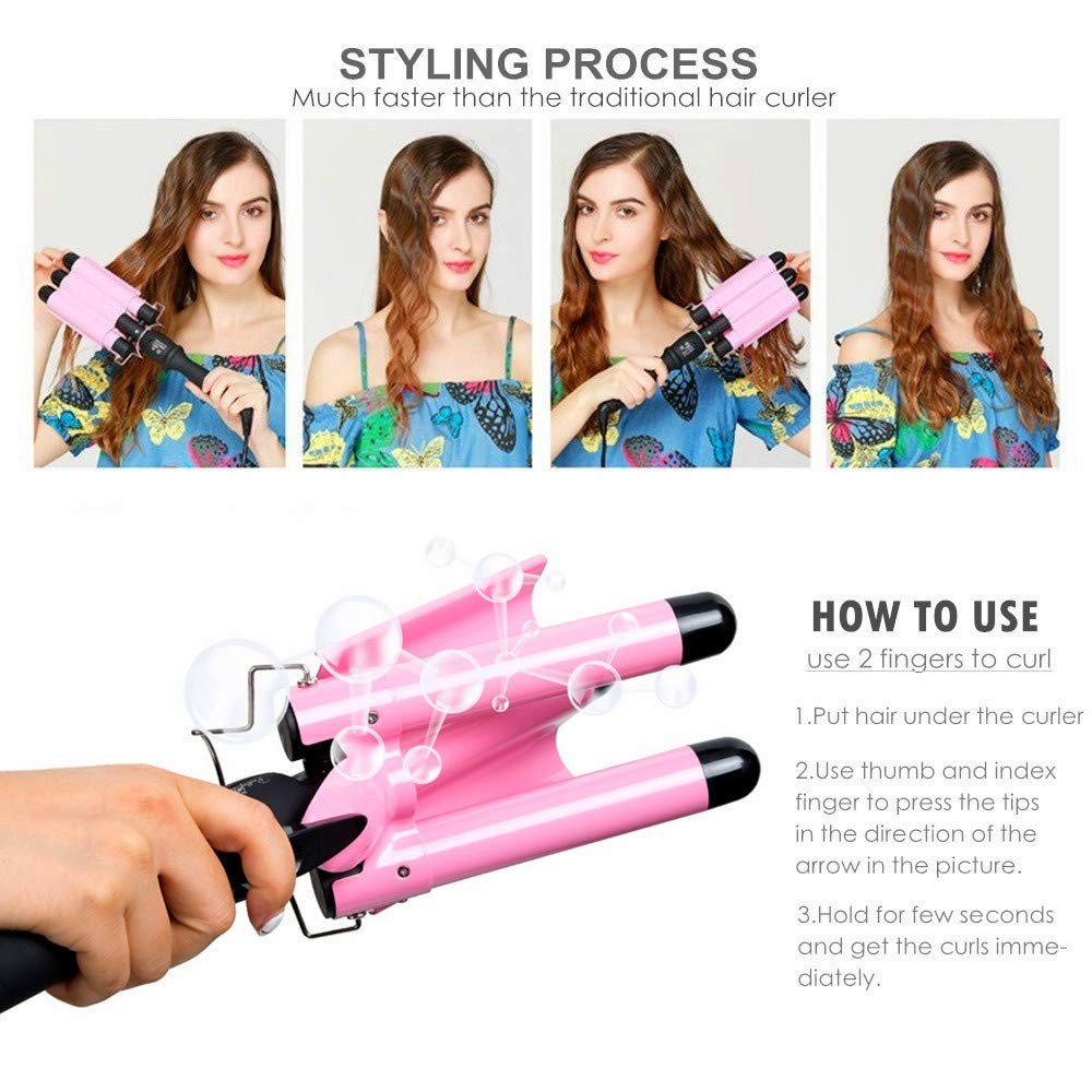 Hair Crimping Iron Curling Iron 3 Barrel Professional Hair Waver 1 inch 25mm Fast Heating Hair Curler with LCD Display Temperature Adjustable Ceramic 3 Barrel Curling Iron 1 Inch for Woman LCD Temperature Display,Triple Barrel Hair Curler Adjustable from 80℃ to 210℃ The 3 barrel hair waver release large amounts of negative ions with the tourmaline ceramic technology when works, which reduces the damage to the hair and make your hair healthier and natural. 3 Barrel Hair Waver - Tourmaline Ceramic S-Waver Creates Loose Sexy S Waves - Tourmaline Ceramic Barrels Help Create Softer, Shinier Waves Without Frizz, Will Give You Flexible, Lustrous, Natural Curl Look Hair - PTC Heating System, Lower Power Consumption - Smooth Item surface, Heat-Resistance, Offering Long Working Time - Temperature Adjustable, Anti-skid handle, LCD screen, Convenient to Use 3 Barrel Curling Iron Description - Color: Pink - Voltage: 110V-220V - Frequency: 50-60HZ - Power: 50-80W - Cable Line Length: 2.5m - Diameter of the barrel: 25mm - Temperature:80-210℃ (176-410℉) Warm Tips - Please do not touch the hot part when heating your hair to avoid scald. - Please do not use sharp things to prevent scratching the curling iron. - Please do not use water to clean the hair curler. Scrub the hair curling iron with cloth or tissue. - The three barrel curling iron will have residual heat after using, please place the hair waver iron on heat-insulation objects and do not touch. - Please use the three curling iron far away from bathroom, water and wet place. - Please Allow a Little Color Difference Because of Different Monitor. - Please spare approximately 1 to 2 inch section of hair to curl to avoid the unsatisfying effect. ✿HAIR PROTECTION OF 3 BARREL CURLING IRON - When the ceramic 3 barrels hair curling wand works,it will release lots of negative ions with the tourmaline ceramic technology, reduces the damage to hair and make your hair healthier, natural and hair shape more lasting, shiny forever. ✿LCD ADJUSTABLE TEMPERATURE - When the 3 barrel curling iron heats up, you can adjust the temperature from 80℃ to 210℃ / 176-410℉(SHOW Celsius ONLY ) which is displayed on the LCD screen. Just choose the right temperature according to your hair. ✿FAST HAIR STYLING - The 3 barrel hair waver curler heats up extra fast,and you can adjust the temperature of the heating according to your hair styles. Easy to give you a fashion look in just few minutes,also long lasting hairstyle,faster than single barrel curling wand! ✿FOR ALL HAIR TYPES:The dual voltage 3 barrel curling iron measures 13 inch in length and 4 inch in width,and barrel size is 1 Inch to suit both long and medium-length hair.Anti-skid ergonomic handle, 360 degree swivel power cord and easy operations of curling wand make your hair curling at home safer. ✿【730 DAYS LONG TIME 】–When you order this ceramic hair crimper iron for women, you are protected by a 730-days .Do not miss it out, just buy one and enjoy a silky, wave, cute, stylish and professional result!