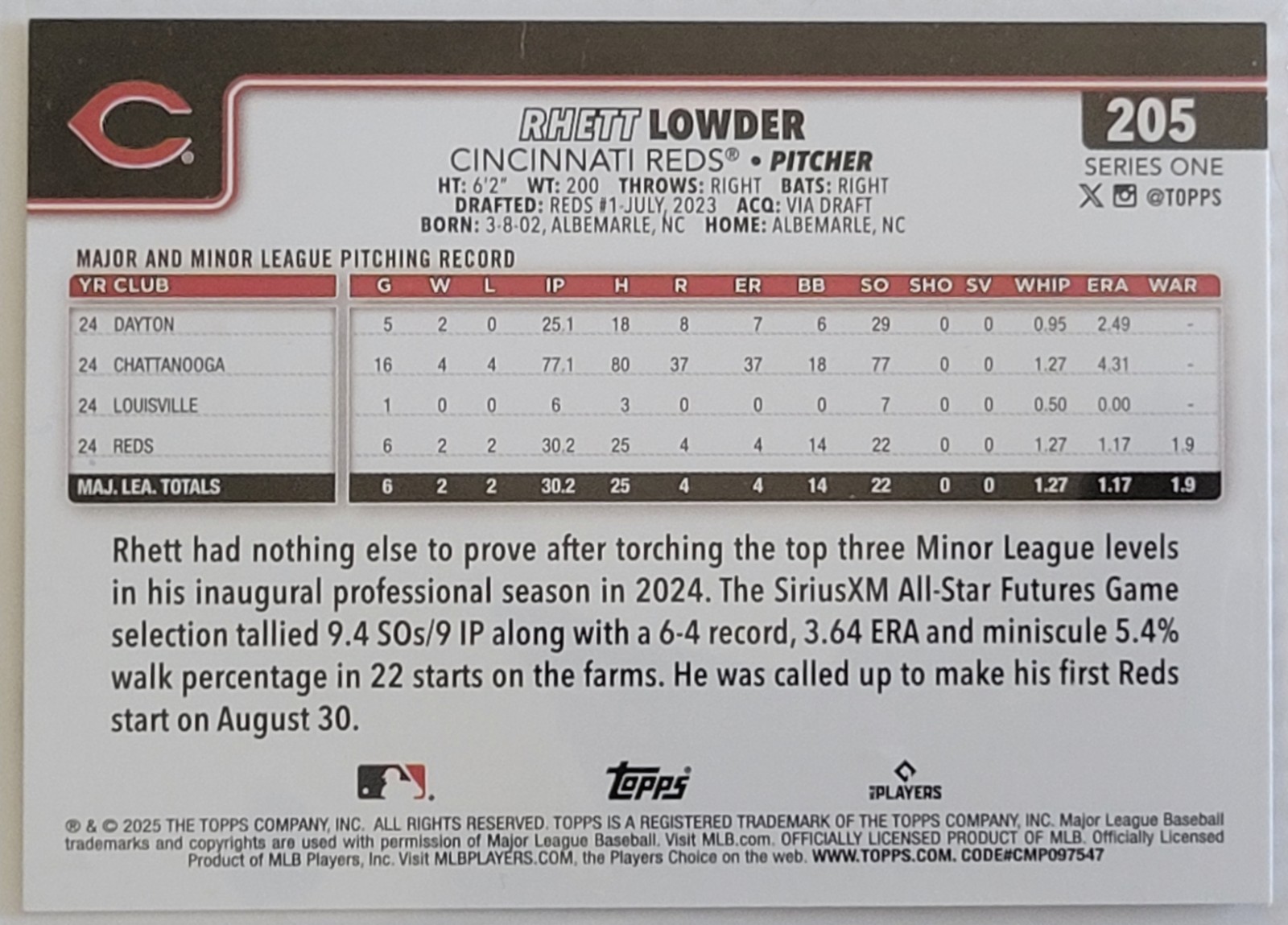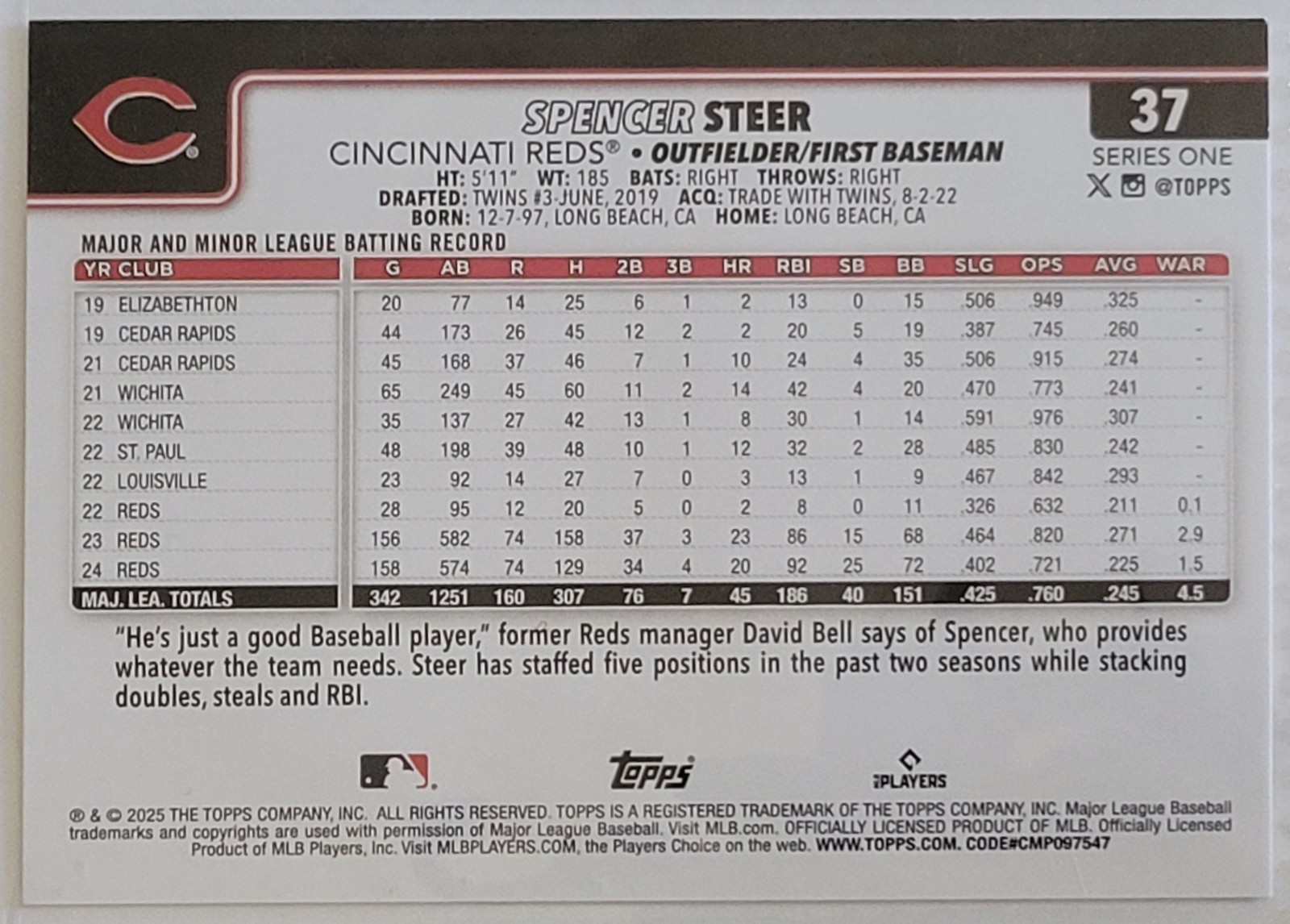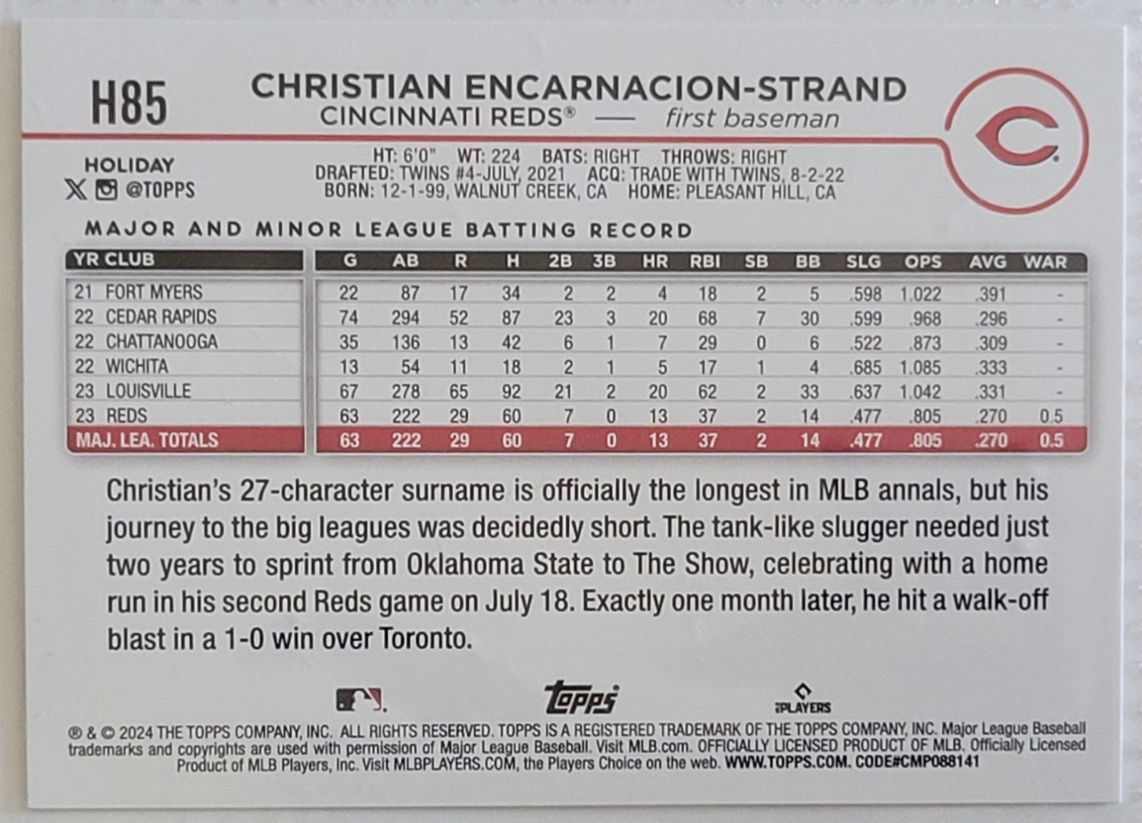 The cards are in excellent condition. The 3 cards for sale in this listing include: 2025 Topps Series 1 Card #37 Spencer Steer *2024 Topps Holiday Card #H85 Christian Encarnacion-Strand Rookie Card* 2025 Topps Series 1 Card #205 Rhett Lowder Rookie Card* Will ship nonmachinable using EBay standard envelope for cheaper shipping costs and secured shipping. Thanks for viewing this listing and feel free to check out more of my listings. Happy collecting!