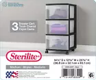 The Sterilite 3 Drawer Cart offers a practical storage solution for any room of the home. Organize and store a variety of household items that are frequently used in the bedroom, kitchen pantry, bathroom, craft room, nursery or dorm room. Clear drawers allow contents to be easily identified while keeping them neat and contained. Drawer stops prevent drawers from being removed accidentally. Use the included casters to create a rolling storage option allowing you to easily transfer the unit from room to room at your convenience. This black drawer cart has a multi-purpose use and is a versatile storage option for any room of the home. It's Ideal for controlling clutter and keeping living spaces neat and organized. Overall Assembled Size: 14 1/2" x 12 5/8" x 24" Three drawers keep contents accessible where are they most often used The clear drawers allow contents to be easily identified while keeping them contained Multi-purpose and versatile storage option for any room of the home Clear drawers allow contents to be easily identified Easy pull out handles with drawer stops to prevent drawers from being removed accidentally Casters are included to create a portable storage solution