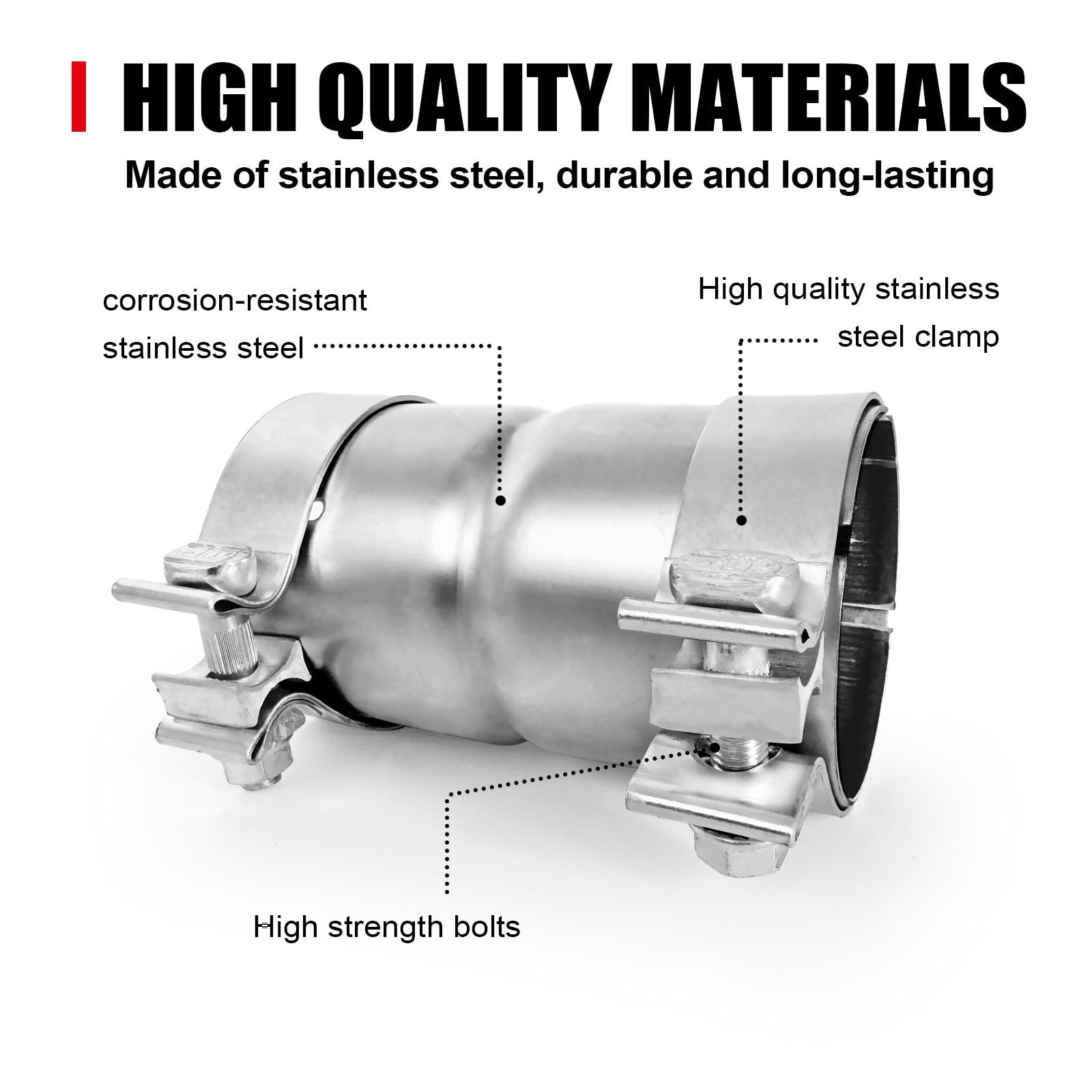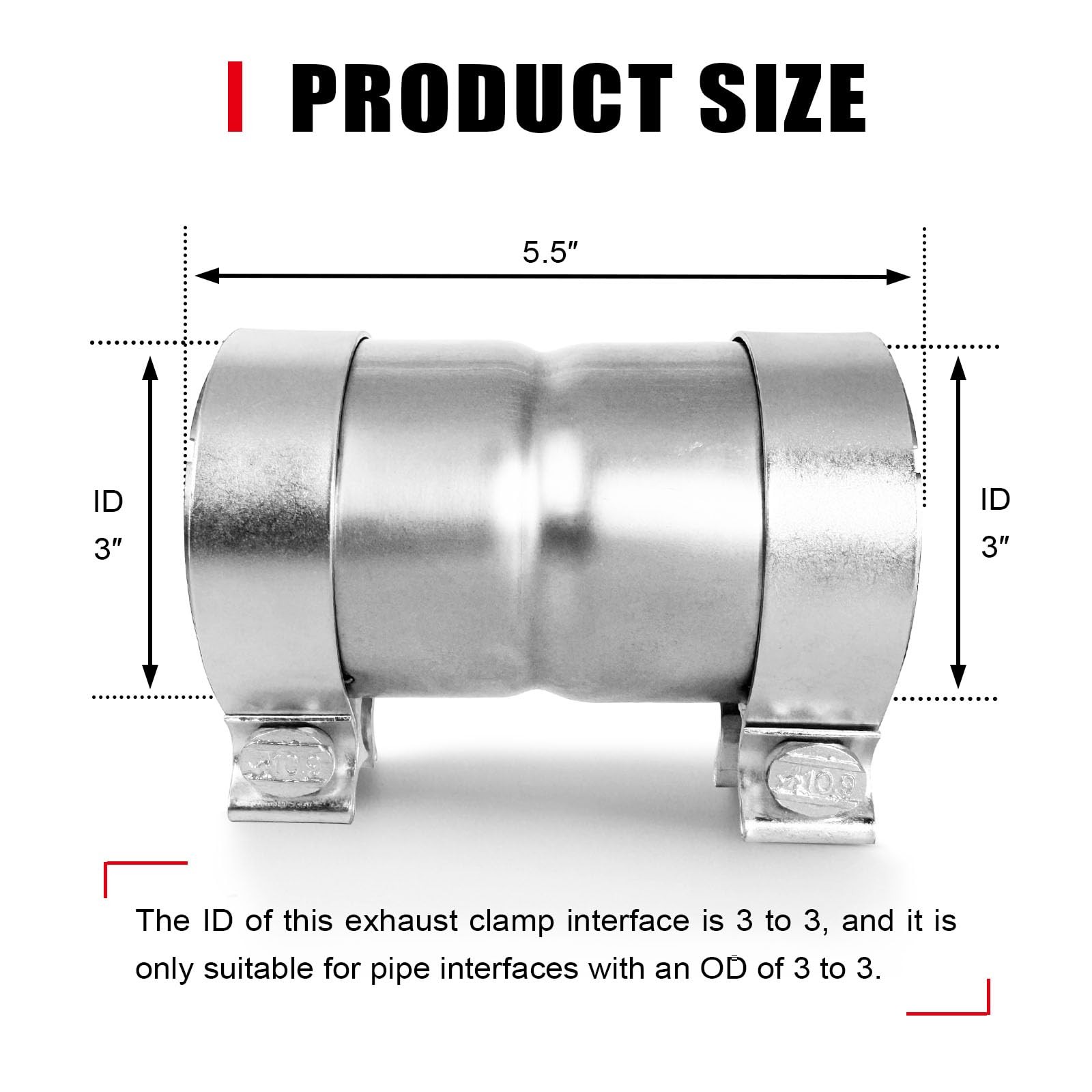3 to 3 Inch Exhaust Adapter, 3" ID Exhaust Reducer Connector Pipe with Clamp 【Material】: Manufactured from 409L mild steel for durability. 【Size】: The ID of this exhaust clamp is 3" to 3", and it can only connect pipes with an OD of 3", other sizes of pipes are not suitable. Please measure the pipe diameter before purchasing. 【Application】: Suitable for connecting pipes with an outer diameter of 3 inch and 3 inch. Suggest using it together with sealant to maintain a better sealing effect. 【Advantages】: With clamps at both ends, no welding is required, and installation is fast. Equipped with high-strength screws, please feel free to contact us if you have any questions during use. As a professional manufacturer of car parts, we have been committed to the production of exhaust clamp. Its our goal to make every customer 100% satisfied. This stainless steel universal exhaust band clamp is our classic product and has been praised by countless customers, designed to quick connection of exhaust pipes without welding. Product Specification: 3" ID to 3" ID Application: Suitable for connecting pipes with an outer diameter of 3 inch and 3 inch Overall Length: 5.5 Inch Style: Tighten the screws. Suggest using it together with sealant to maintain a better sealing effect. 100% satisfaction guarantee We are full of confidence in the quality of this exhaust coupler, and are willing to solve any problems about it for you. Shipping We offer FREE shipping on all orders! We ship within Three business days of payment, usually sooner. We use a selection of shipping services such as UPS, FedEx, USPS etc. We only ship to the lower 48 states, no APO/FPO addresses or PO Boxes allowed. Local pickups and combined shipping options are not provided at this time. Return You can return a product for up to 30 days from the date you purchased it. Any product you return must be in the same condition you received it and in the original packaging. Please keep the receipt. Payment We accept payment by any of the following methods: PayPal Please pay as soon as possible after winning an auction, as that will allow us to post your item to you sooner! Feedback Customer satisfaction is very important to us. If you have any problem with your order, please contact us and we will do our best to make you satisfied. Contact Us If you have any queries, please contact us via ebay. We usually respond within 24 hours on weekdays. Please visit our eBay store to check out other items for sale! Thank you for shopping at our store.