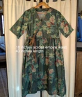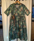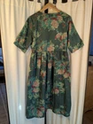 3 Fat Men Dress Maxi Women Floral Green Boho Sz Large V-neckline with buttons, empire waist, side tie. Apron style. Short sleeves. Side pockets. Green floral desgin No content label: possibly polyester/cotton Prairie, cottagecore, boho styling Gently used. No size tag Approx Large- please see measurements 18 inches across empire waist 43 inches length