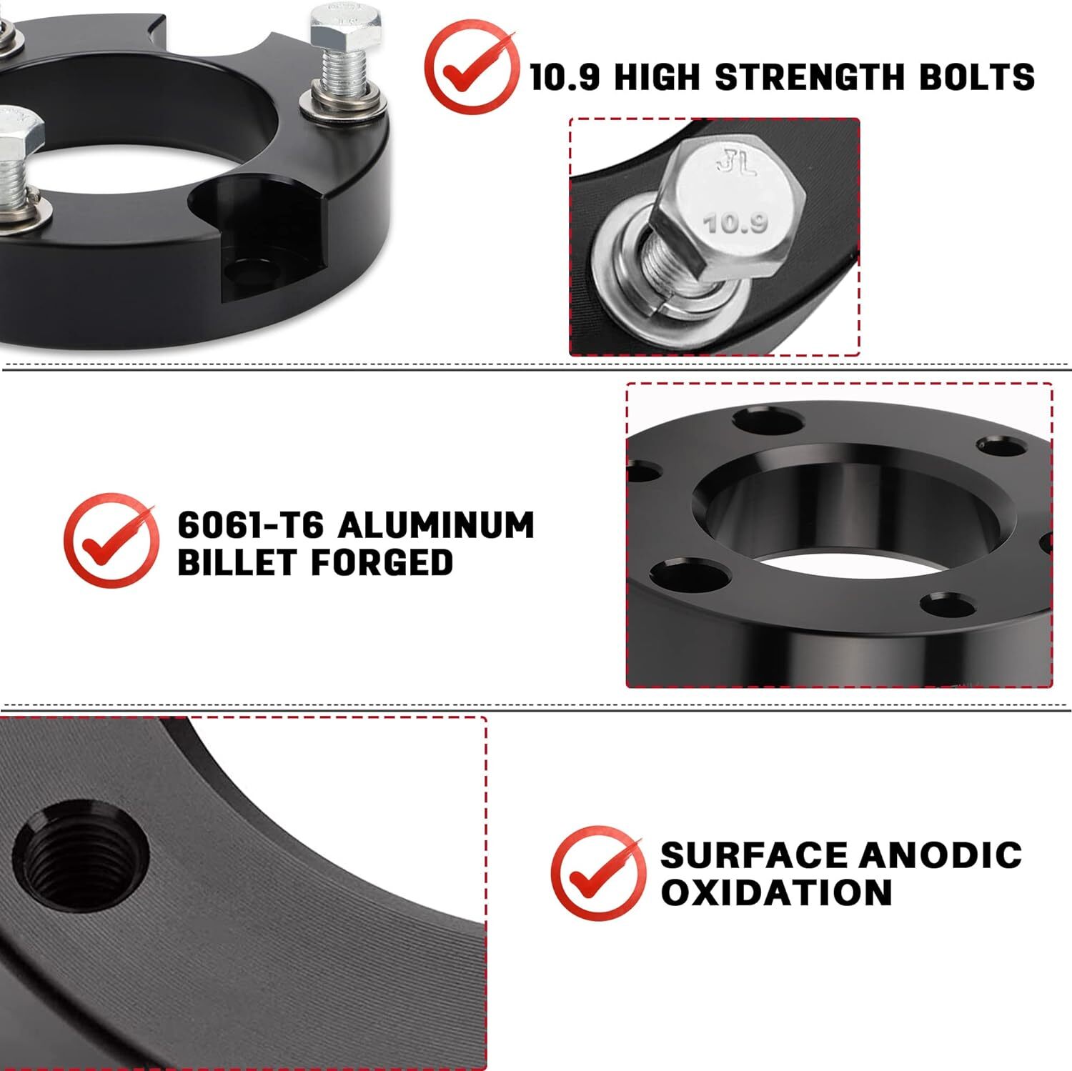 Fitment: 2005-2022 Tacoma 2WD 4WD (only fit 6 lugs) 2003-2022 4Runner 2WD 4WD (Don't Fit X-REAS) 2007-2015 FJ Cruiser 2WD 4WD Package List: 2 * Front Leveling Lift Kit Features: 【Increase the height of your truck】: It will raise the front of your truck by 3 inch , Because of suspension geometry,the ratio between lift height and kit thickness is not 1:1. 【Appropriate application】: Compatible with 2005-2024 Tacoma 2WD 4WD (only fit 6 lugs), 2003-2024 4Runner 2WD 4WD (Don't Fit X-REAS), 2007-2015 FJ Cruiser 2WD 4WD. 【Aggressive look】: Once you install leveling kit on your truck,it will give your truck a cool look.Accurate numerical control precision and high quality, ensure your driving safe and comfortable. 【Process and Material】: Forged from 6061-T6 aluminum alloy,CNC automatic processing,surface anodic oxidation and heat treatment,not only ensure high precision and stability,but also enhance the hardness and corrosion resistance of the material,The product itself is also equipped with 12.9 class studs. 【Warranty and Services】: All Leveling kits are covered by 2 years warranty,Please feel free to contact us with any questions regarding our products and services. Fitment: 2005-2022 Tacoma 2WD 4WD (only fit 6 lugs) 2003-2022 4Runner 2WD 4WD (Don't Fit X-REAS) 2007-2015 FJ Cruiser 2WD 4WD Package List: 2 * Front Leveling Lift Kit