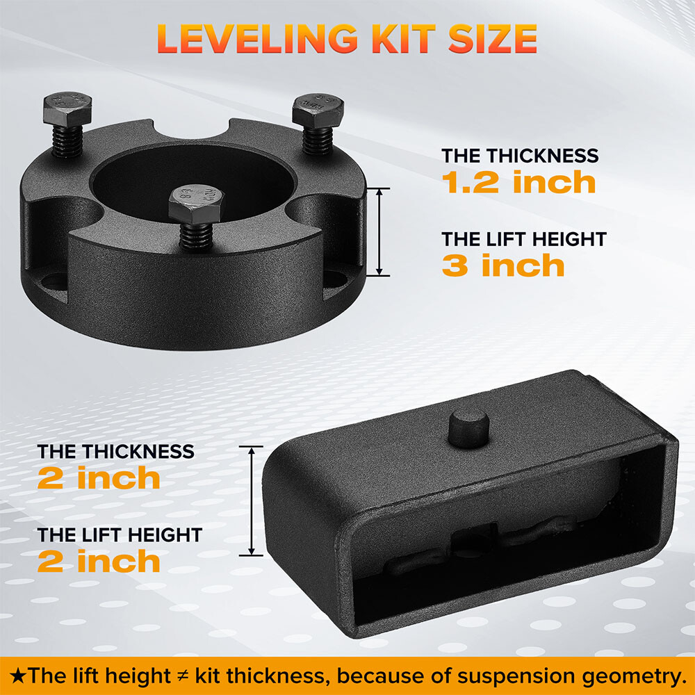 【Compatible】Leveling lift kit replacement for 1995-2004 Tacoma (6 lug models only) FITMENT - 3" Front and 2" Rear Leveling Lift Kit for 1995-2004 Tacoma. RAISE THE VEHICLE HEIGHT - These will raise the front of your truck by 3 inch and the rear of your truck by 2 inch, Because of suspension geometry,the ratio between lift height and kit thickness is not 1:1 AGGRESSIVE LOOK - Once you install it on your truck,it will give your truck a cool look.Accurate numerical control precision and high quality, ensure your driving safe and comfortable MATERIAL - Forged from 6061-T6 aluminum alloy,CNC automatic processing,surface anodic oxidation and heat treatment,not only ensure high precision and stability,but also enhance the hardness and corrosion resistance of the material WARRANTY & SERVICES - All Leveling kits are covered by 2 years warranty,Pls feel free to contact us with any questions regarding our products and services Compatible with: 1995-2004 Tacoma 2WD 4WD (6 lugs only) Does not fit 5-Lug Tacoma models Important Note: Lift the front by 3". Due to suspension geometry, the ratio of the lifting height to the thickness of the lift kit is not 1:1. Package: 2 x 3inch Front Leveling Lift Kit 2 x 2inch Rear Leveling Lift Kit 4 x U-Bolt 1 Set Nut.