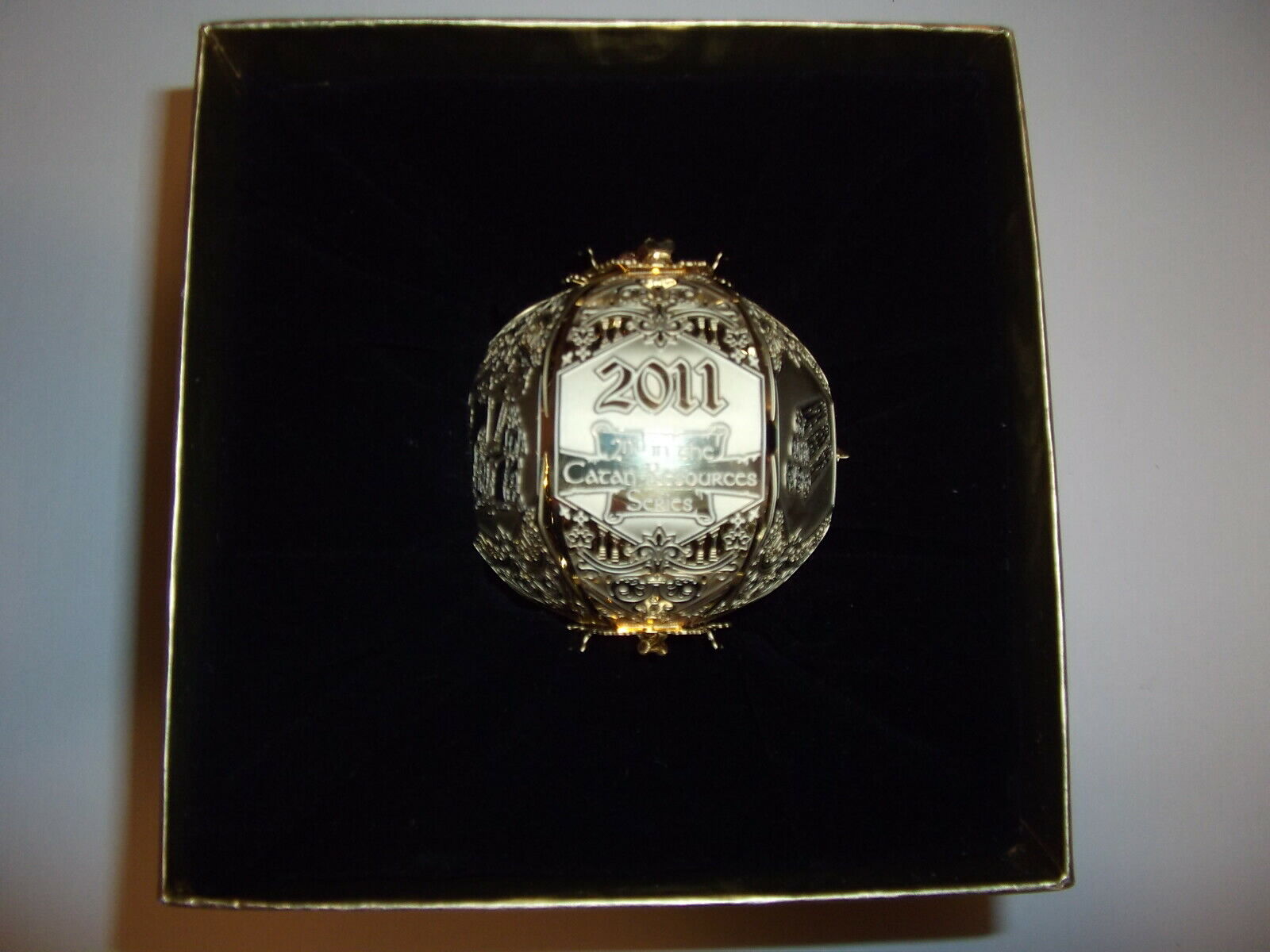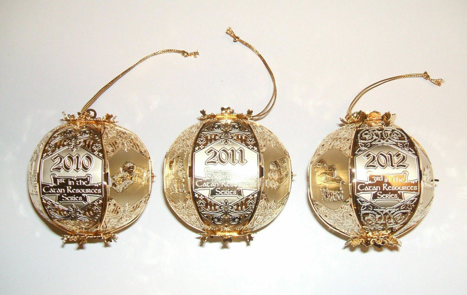 3 NEW SETTLERS OF CATAN Cut Brass Ornaments Mayfair Games WHOLESALE LOTS MIB NIB Packaged in deluxe presentation boxes, these stunning brass ornaments are sure to delight Catan fans and collectors. Each ornament features the Mayfair Games and Catan logos, with scenes during the production of these resources: 2010 BRICK (1st in the Catan Resources Series) 2011 WOOD (2nd in the Catan Resources Series) 2012 SHEEP (3rd in the Catan Resources Series) SHIPPING $4.99 USPS Economy Mail. BUY MORE AND SAVE MORE! EXCELLENT BIRTHDAY & HOLIDAY PRESENTS!