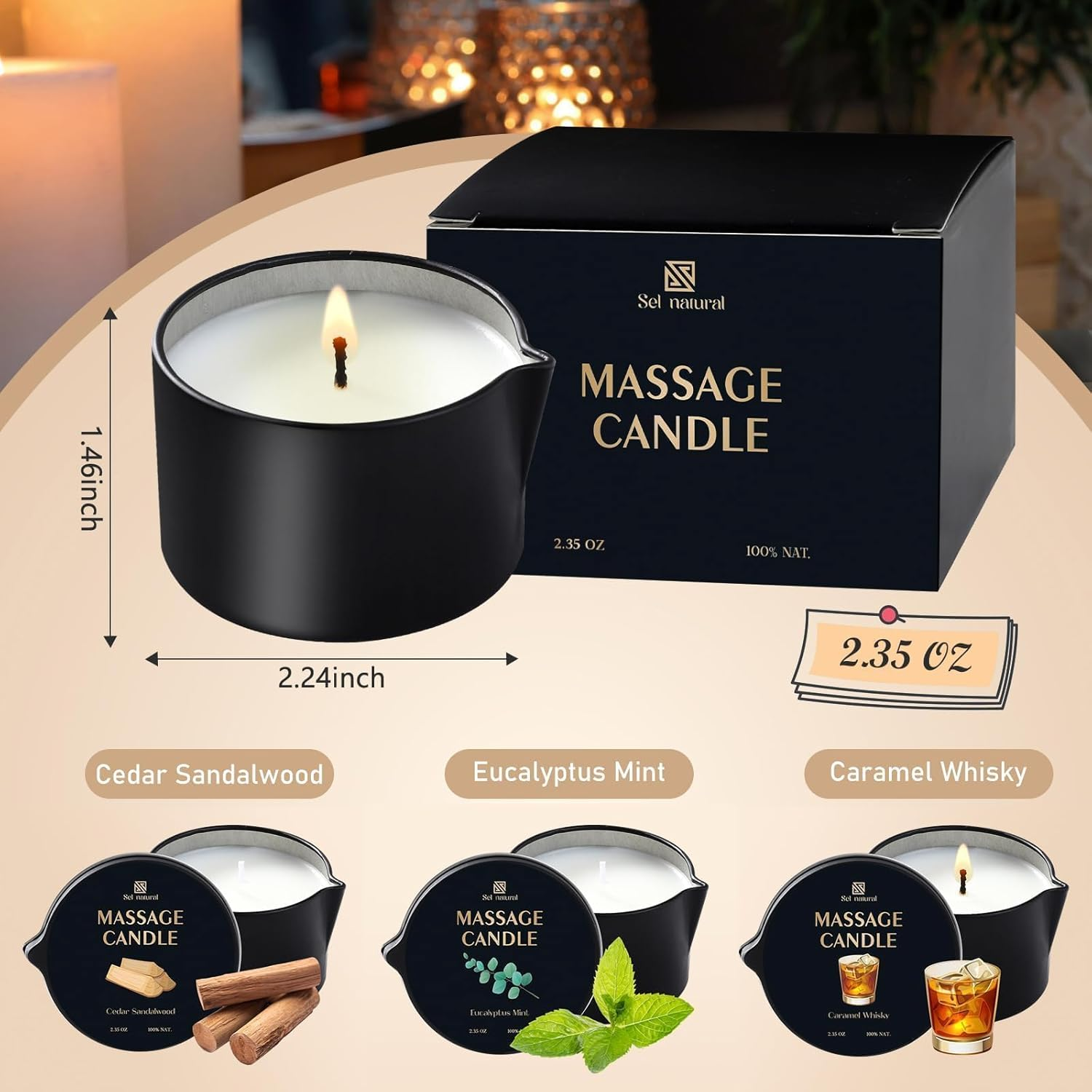 Massage Candle Gift: You will receive 3 massage oil candles with 3 pleasant scents: Eucalyptus Mint, Cedar Sandalwood, Caramel Whisky; Scented candles not only create a soothing atmosphere, but also transform into nourishing massage oils that rejuvenate your body Premium Ingredients: These massage candles are made with high quality natural soy and coconut oil and are served in a metal jar. Each candle is 2.35 ounces. The formula ensures fast absorption and leaves your skin hydrated, nourished, and soft How To Use: Only need to light the candle for about 30 minutes to melt the wax into oil; Test the temperature with your fingers and pour the warm oil on your skin. Warm massage oil heated to about 40 degrees Celsius will help soften and moisturize your skin Dual Purpose Candles: our multi-purpose massage wax candles; Not only can it illuminate, providing a warm, inviting glow, it can also act as a home scented candle, emitting a pleasant smell; They nourish your skin and massage your body to relax Warm Experience: Massage oil candles can be used for gua sha manipulation or simply to enjoy a relaxing spa experience, just like at home; Enjoy the soothing benefits of our scented candles that enhance your self-care, individually packaged and perfect for gift-giving Product description