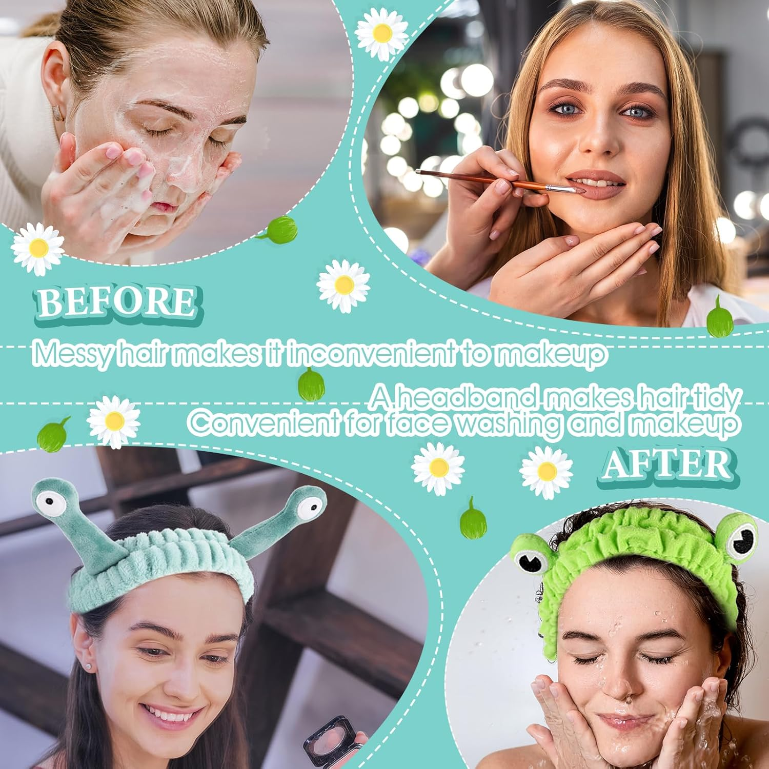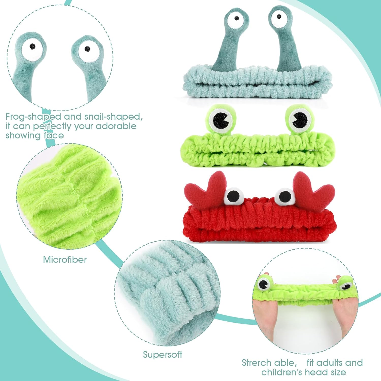 【High-quality Soft Material】These spa headbands are made of high-quality coral fleece, skincare headband is soft and fluffy, comfortable to the touch, and highly absorbent. The fine craftsmanship and high-quality materials provide a luxurious touch and the headband for washing face enhances your comfort in use 【Cute Design】These makeup headbands come in three charming designs - snail, crab, and frog. Each face wash headband is not only cute but also practical, cute headbands for women with an elastic band to ensure that the facial headband does not slip off, making your skincare routine more enjoyable 【One Size】Our beauty hairbands are made of high-quality elastic material and cartoon elastic head band are able to automatically adjust to fit any head circumference. This ensures a tight but comfortable fit, providing you with a worry-free and enjoyable wearing experience. 【Multi-purpose】These shower head wraps are perfect for a variety of activities, including spa, face washing, showering, makeup, bathing, practicing yoga, etc. The creative hair accessories effectively move the hair away from the face, making the elastic headband a must-have accessory in your daily skincare and beauty routine 【What You Will Get】You will receive 3pcs cute face washing headbands, each with a unique design, cute appearance, and practical functions, making them perfect as gifts for family or friends on Christmas, Halloween, birthdays, Thanksgiving, Valentine's Day, and other festivals 3 Pieces Face Wash Hairband Spa Headband Facial Makeup Hair Band Skincare Head Wraps Cartoon Elastic Head Band Cute Frog Snail Crab Creative Hair Accessories for Shower Beauty Sports Main functions : The headband is soft and fluffy, creative and cute, perfect for face washing, showering, makeup, yoga, etc. Color : Green, Red Product size : Snail headband: Eye length10cmcm, Headband diameter19.5cm, wide 5.5cm, Stretched up to 27cm Frog headband: Eye length 4.5cm, Headband diameter 19.5cm, width 5cm, Stretched up to 30cm Product includes : 3pcs × Face Washing Headband