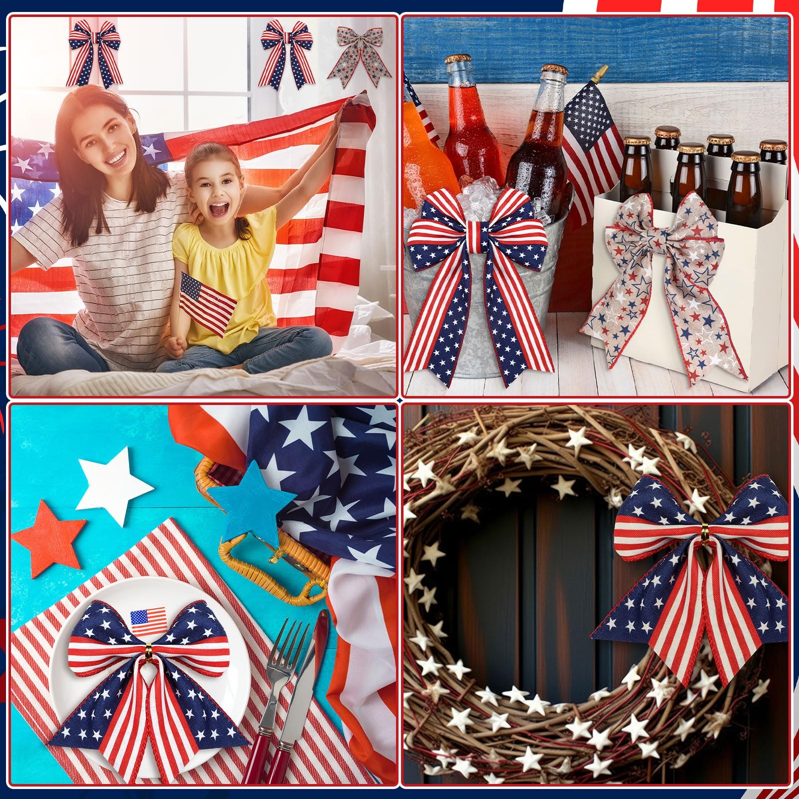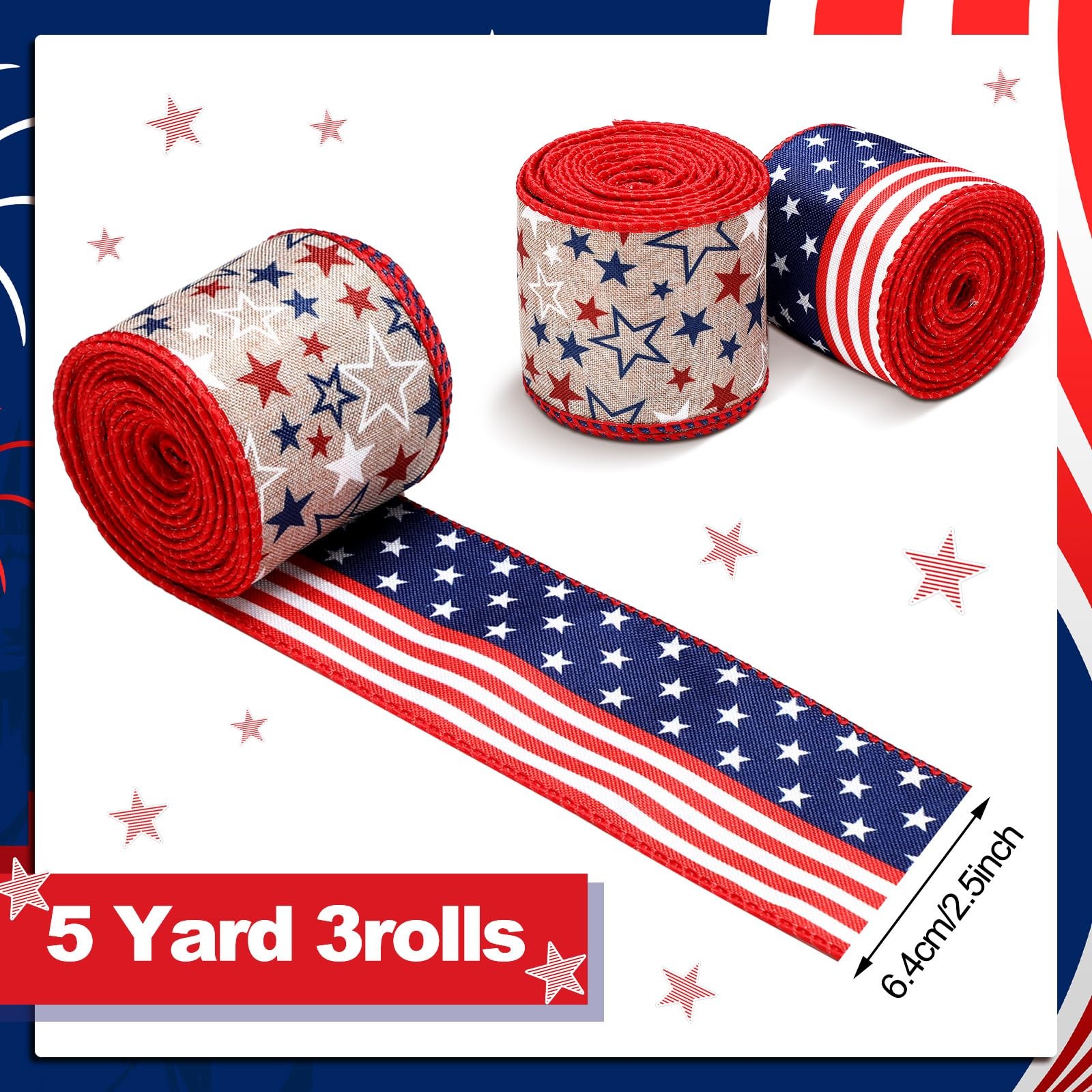 Features: Versatile uses and wide applications: Our decorative wired ribbons are ideal for a variety of crafting projects such as making bows, wreaths, bouquets, and decorating trees, chairs, garlands and gifts. These ribbons can also be applied to add a festive touch to stairs, balustrades, tables, doors, porches, windows, driveways, and lamp posts, literally any corner of your house. Safety measures: The ribbon is hand cut, and there might be iron wires at the cutting place. While this ensures the durability of the ribbons, we advise customers to handle with care when they unroll it. Specifications: Material: polyester Color: white, red and blue Size: about 2.5" x 5 Yards Package includes: 3 X Patriotic wired edge ribbon Notes: Manual measurement, please allow slight errors on size. The color may exist a slight difference due to different screen displays Ample Amount and Eye Catching Designs: each package contains 3 rolls of star and stripe wired ribbons, providing a total of 15 yards for your crafting needs; The ribbons come in 2 patterns printed on both sides, ensuring enough material for long lasting use while adding variety to any patriotic themed decorations or crafts you're making Celebrate Independence Day in Style: the star and stripe patterns of the patriotic ribbon are nice in line with the theme of Independence Day; Ideal for adding a festive touch to Memorial Day, Election Day, Veterans Day, Labor Day, and 4th of July parties, our ribbons are a must have for any patriotic celebration Quality and Durable Material: constructed from polyester material, our patriotic wired ribbons are designed for resilience; They are difficult to break or tear and are meant to stand the test of time; In addition, these ribbons sport sewn locking edges to against any wear and tear Easy to Craft with Flexible Design: each flag ribbon is lined with iron wire on both sides, making it easy to roll and fold into different shape you desire; The advantage of this design feature is that it enhances your crafting experience by allowing you more freedom and flexibility Double Sided and Reversible Design: featuring a reversible design, these 4th of July decorative ribbons are printed with stars and stripes on both sides, creating a refreshing and versatile ornament; The sided design can meet your different usage scenarios, and be a nice addition to your crafts