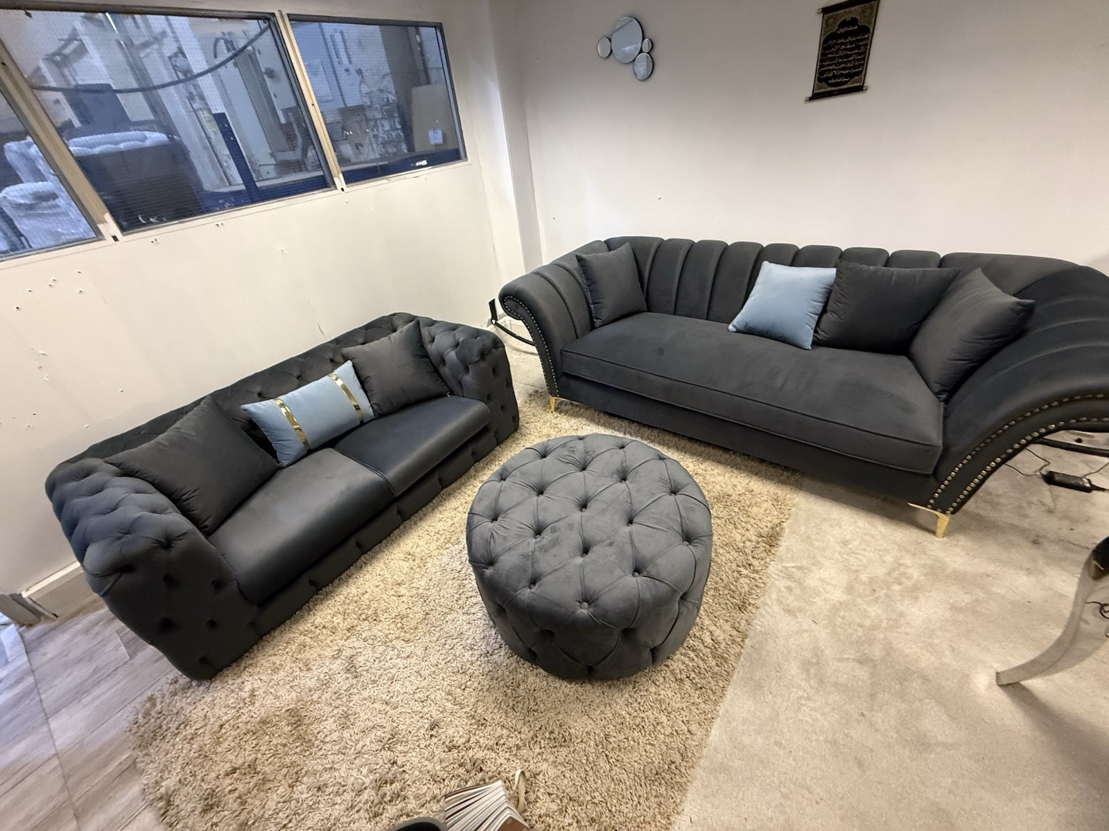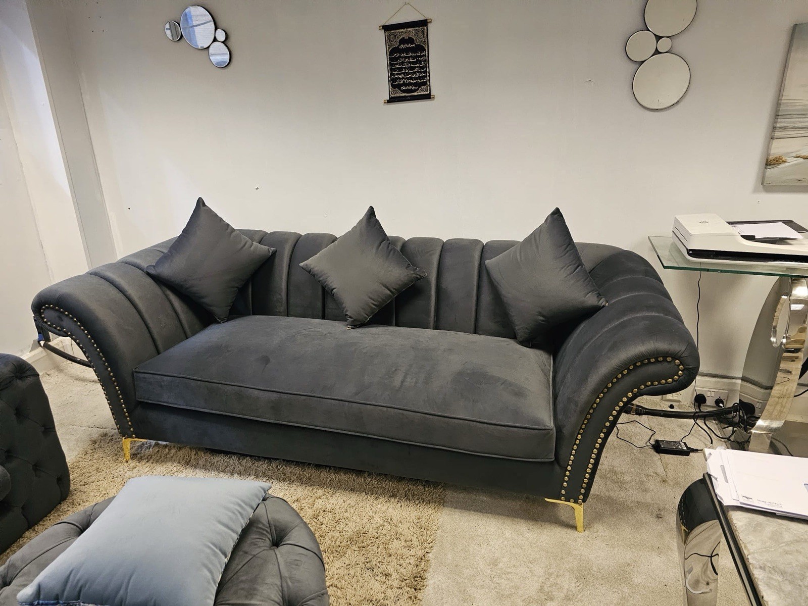This elegant 3-seater velvet sofa blends comfort and luxury in one design. With its deep fluted back, curved studded arms and gold metal feet, it brings a modern classy look to any living room. Soft upholstery and three matching cushions provide a cosy and stylish seating experience.