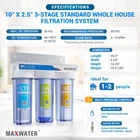 3-stage Whole House/Cottage Water Filter for city water Our 10” Standard Whole House is cost-effective for smaller spaces such as RVs, apartments, cottages and any other light duty applications where space is at a premium. This system will not disinfect water should only be used in areas where the water supply is biologically safe, or in conjunction with a UV sterilizer or other disinfection techniques. If you have a larger home/cottage or have more than 2 people using the water consistently, you may want to consider looking at some of our higher capacity systems. Pre-loaded Filter Cartridges: 1st Stage: 5-micron Polypropylene Sediment Filter 2nd Stage: Granular Activated Carbon (GAC) Filter 3rd Stage: Carbon Block (CTO) Filter Reduces: Sediment (silt, dirt, rust, ETC.) Pesticides Bad Taste & Odors Giardia Cysts Chlorine Turbidity Herbicides VOCs (Volatile Organic Compounds) THMs (Trihalomethanes) MTBEs (Methyl Tert-Butyl Ethers) Includes: 1x 3-Stage White Steel Mounting Bracket 3x 10" Clear Filter Housing, ¾ NPT Inlet/Outlet 1x 10" Standard 5-micron Polypropylene Sediment Filter 1x 10" Standard Granular Activated Carbon (GAC) Filter 1x 10" Carbon Block (CTO) Filter 1x Opening Spanner/Wrench Specifications Filter Life: Approx. 6 to 12 months Maximum Operating Pressure: 125 psi Maximum Operating Temperature: 125°F Recommended Operating Temperature Range: 40-100°F Dimensions: 15" Height x 15" Width x 6" Depth Total Weight: Approx. 17 Lbs with Filters Flow Rate: 1-10 GPM* for ¾" Inlet/Outlet *Pressure drop will be determined based on feed water pressure, filter cartridge, fluid viscosity, filter life, and conditions. Classic Drinking Filter: The water flows through PP sediment filtration (5 Micron), dual carbon filtration (GAC + CTO (5 Micron)). It filters out common sediments in drinking water, like dust, sand, particles, dirt, and rust. Effectively addresses impurities, cloudiness, colors, and more. It also improves the taste and neutralizes odor. Fresh Healthy Water Supplier : The on-demand fast flow rate of the WH 3 stage system allows it to meet the widest possible range of needs in your home. Up to 20x more effective than the common water pitcher dispenser. Flow Rate: Up to 1 - 8 GPM* depending on source water pressure. Maximum Pressure: 90psi. It washes fresh produce like fruit and vegetables, can provide your entire family with delicious, clean water straight from your tap. Excellent Quality and Design : Features beautiful designed clear see-through 3 stage housing. Clear see-through housings makes filter inspection a snap. Manufactured to comply strictly with quality standards for water quality, material safety and structural integrity. Easy to Install and Maintain: This system is designed for easy installation, low maintenance, and features dual carbon filters along with a high-capacity sediment filter. The sediment filter protects and extends the life of your system, while the carbon filters work to improve water quality and odor. You can replace the filter every 6 to 12 months, judged by the water’s taste. Use only original MaxWater replacement parts and filters for best results. TDS Note and Customer Services: This under sink water filter will not alter the TDS of the incoming water. Instead, it keeps the healthy minerals in your water. If you are interested in a filter that addresses TDS, please consider a reverse osmosis system. Backed by a 1-year Manufacturer warranty. For any issue or concern, please don't hesitate to contact us.