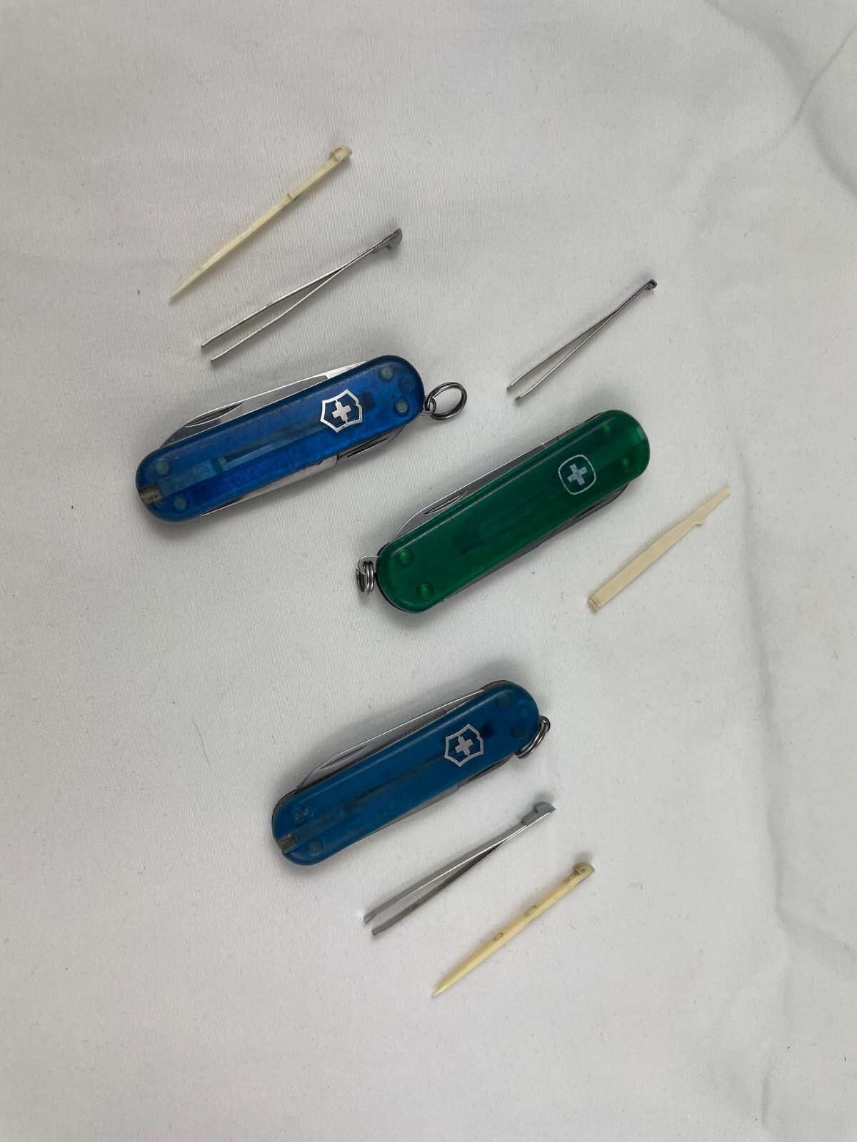 Three Swiss Army Classic Multi Tool's. 2 are blue and one is green. They will need some cleaning. For inventory - H15