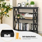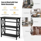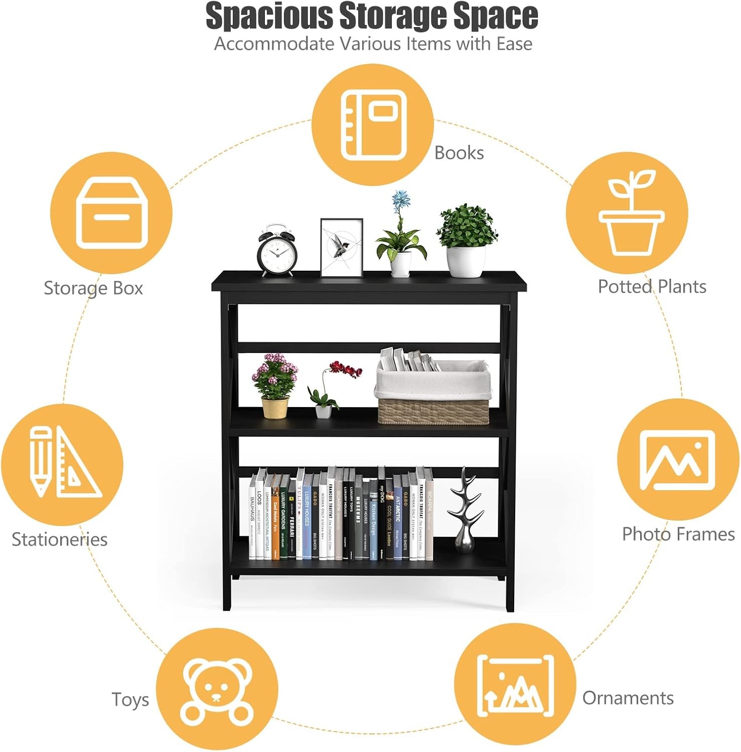Product Description About this item 【Ample 3 Shelf Storage】This 3 tier bookshelf offers sufficient storage space. You can store books, daily essentials or storage boxes on the lower 2 shelves and display some plants, photo frames or collections on the top. 【Compact for Space Saving】The compact 30’’ x 12.5’’ x 34’’(W x D x H) size makes this small open shelf a perfect fit for small spaces. You can either put it in the corner or by your desk. The slim design could make full use of limited space. 【Strong & Safe Structure】Constructed with thickened boards, this short bookcase it built to last. The X frames on both sides and reinforced bars behind add more stability. And there are also anti-toppling devices behind to ensure safety in daily use. 【Easy to Assemble & Clean】With detailed instruction included and all parts labeled clearly, you can easily install this display shelf in no time. The smooth and waterproof surface is also easy to clean with some damp cloth. 【Multifunctional Open Shelf】Featuring a simple modern style, this low bookshelf could fit with kinds of decorations. You can put it in the living room for display, in the study to classify books, in the bedroom for organize or in the hallway to put shoes. Description If you need a short bookshelf for your limited space, our 3 tier bookcase may just the one you need. The compact size is perfect for rooms with small spaces. And the 3 shelves offer sufficient storage space for your books, daily essentials or collections. High quality thickened boards with reinforced X frames and bars make it a long-lasting piece. You are rest assured to put it in the hallway, living room, study or bedroom and it would serve the purpose well. Just get one and you would find it value for money! Features ·Simple modern style fits with kinds of decorations ·3 tier shelves with ample storage space ·Compact slim size for space saving ·Premium thickened boards for sturdiness ·X frames and reinforced bars add more stability ·Anti-toppling devices behind for safety use ·Detailed instruction easy to install ·Smooth and waterproof surface easy to clean ·Multifunctional shelf for various scenarios Specification Material: Pine Wood, MDF Overall Dimension: 30’’ x 12.5’’ x 34’’(W x D x H) Net Weight: 14.6 LBS Weight Capacity of Top: 88 LBS Weight Capacity of Each Shelf: 55 LBS Package Includes: 1 x Bookshelf 1 x Instruction On Aug 17, 2025 at 19:21:53 PDT, seller added the following information: