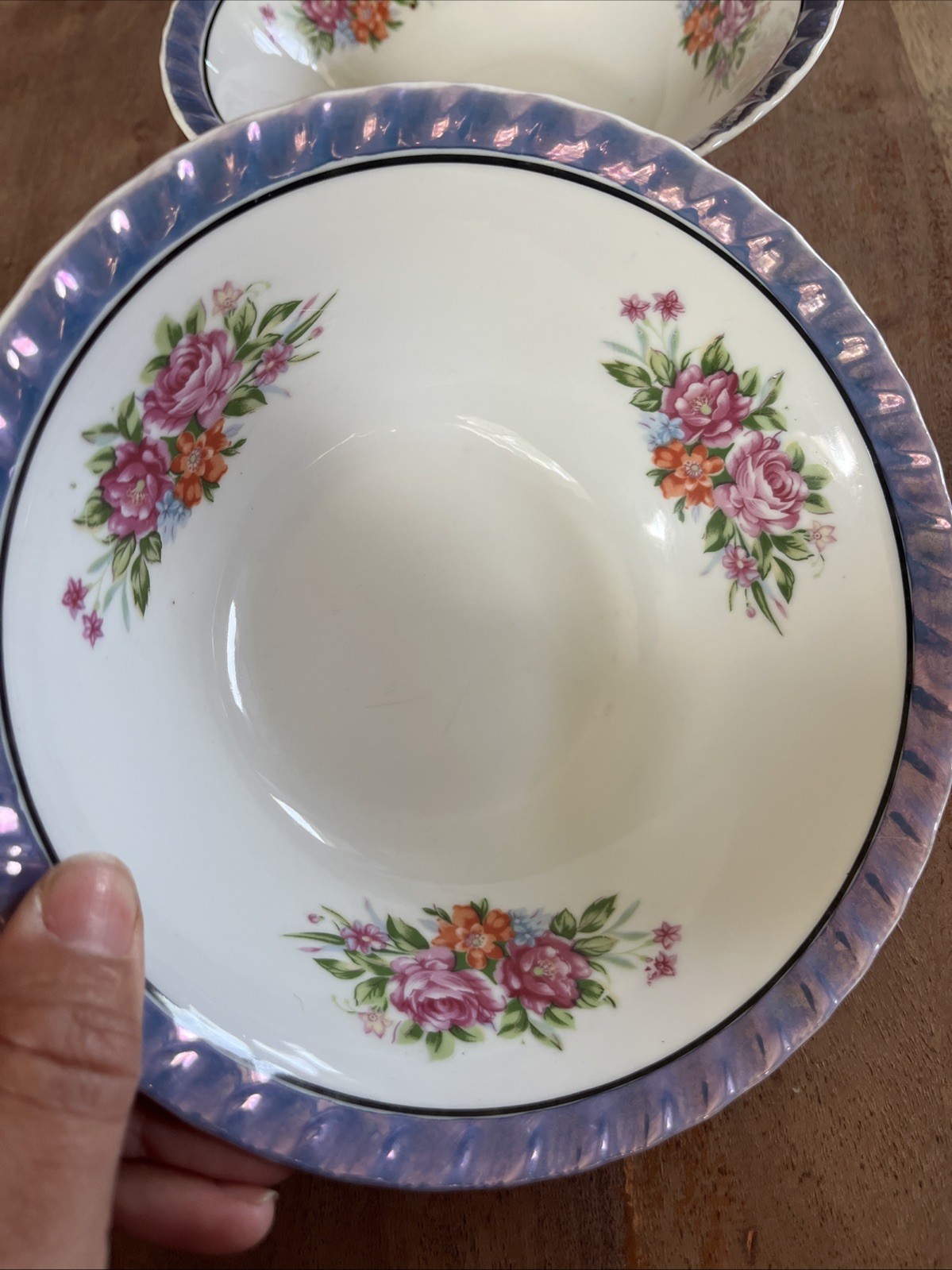 These Yamatsu Japan serving bowls are a vintage three-piece set featuring a beautiful floral design in blue and white. Made of porcelain with a glossy finish, these round bowls have a scalloped rim and were hand-painted in Japan in 1973. The decorative and art pottery production style adds a touch of elegance to any occasion. Perfect for all occasions, these vintage original bowls are a charming addition to any dining set. 2.5” tall