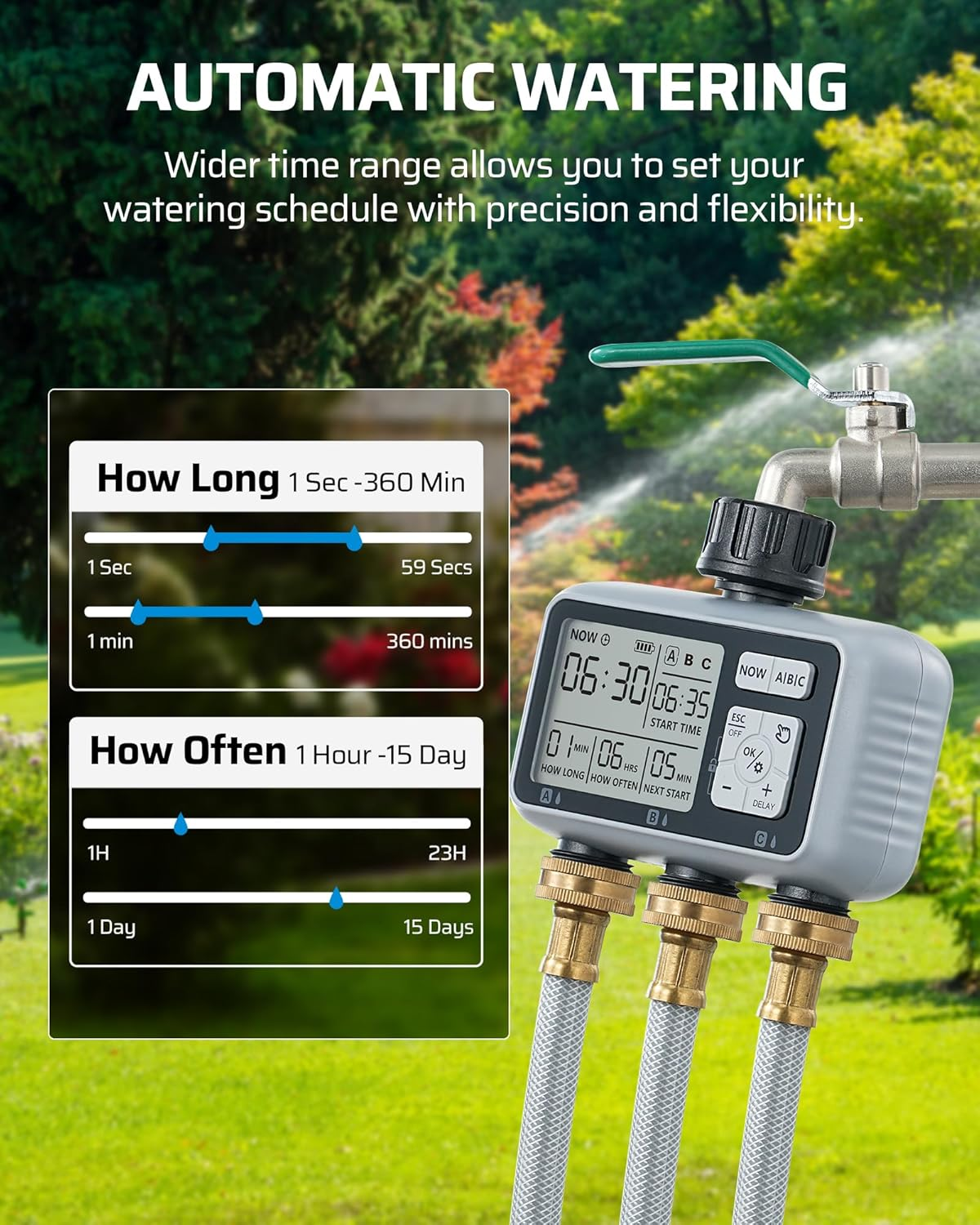 This sprinkler timer is a game-changer for anyone who wants smart, hassle-free watering! The three independent zones let me customize schedules perfectly for my lawn, flower beds, and veggie garden. The large, bright display makes it super easy to adjust timing and check settings at a glance. Setup took minutes—just press a few buttons and it’s ready to go. Rain delay? No problem! I love how it saves water while keeping my plants happy. The battery life is impressive, and the sturdy design handles outdoor conditions without issues. Highly recommend for effortless yard care!