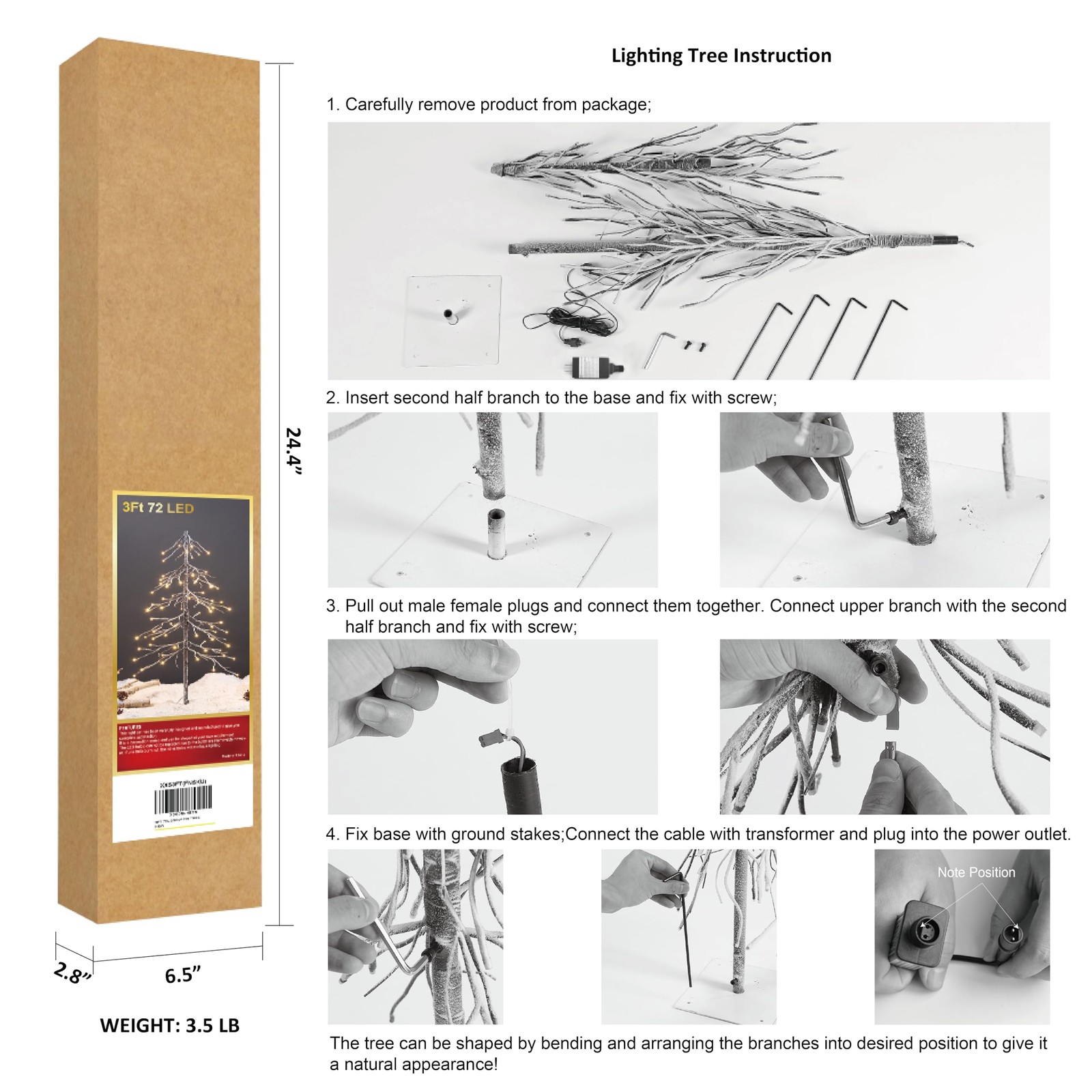 Snowy Fir Tree, 144 Lights, for Indoor and Outdoor Use, Warm White, for Home Festival Party Christmas Unique Design of 3FT Snowy Fir Tree: The tree is designed to resemble a fir tree with artificial snow and frost, giving it a winter wonderland appearance. This can enhance the festive and seasonal feel of the tree. Flexible Branch: Bendable branch DIY for shaping a natural tree, so you can reshape them as desired, sturdy enough to relatively ornaments. Energy Saving: lights meet the need for brightness, energy saving, and a long life of up to 30,000 hours. Safety Low Voltage: UL-certified and waterproof adapter with VI energy efficiency at 24 low voltage. Durable Construction and K-D Design: The tree is made of PVC materials and it has sturdy base, which designed to withstand repeated use over the holiday seasons.Widely used for home, , garden, Christmas, party, wedding and all kinds of festival.