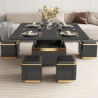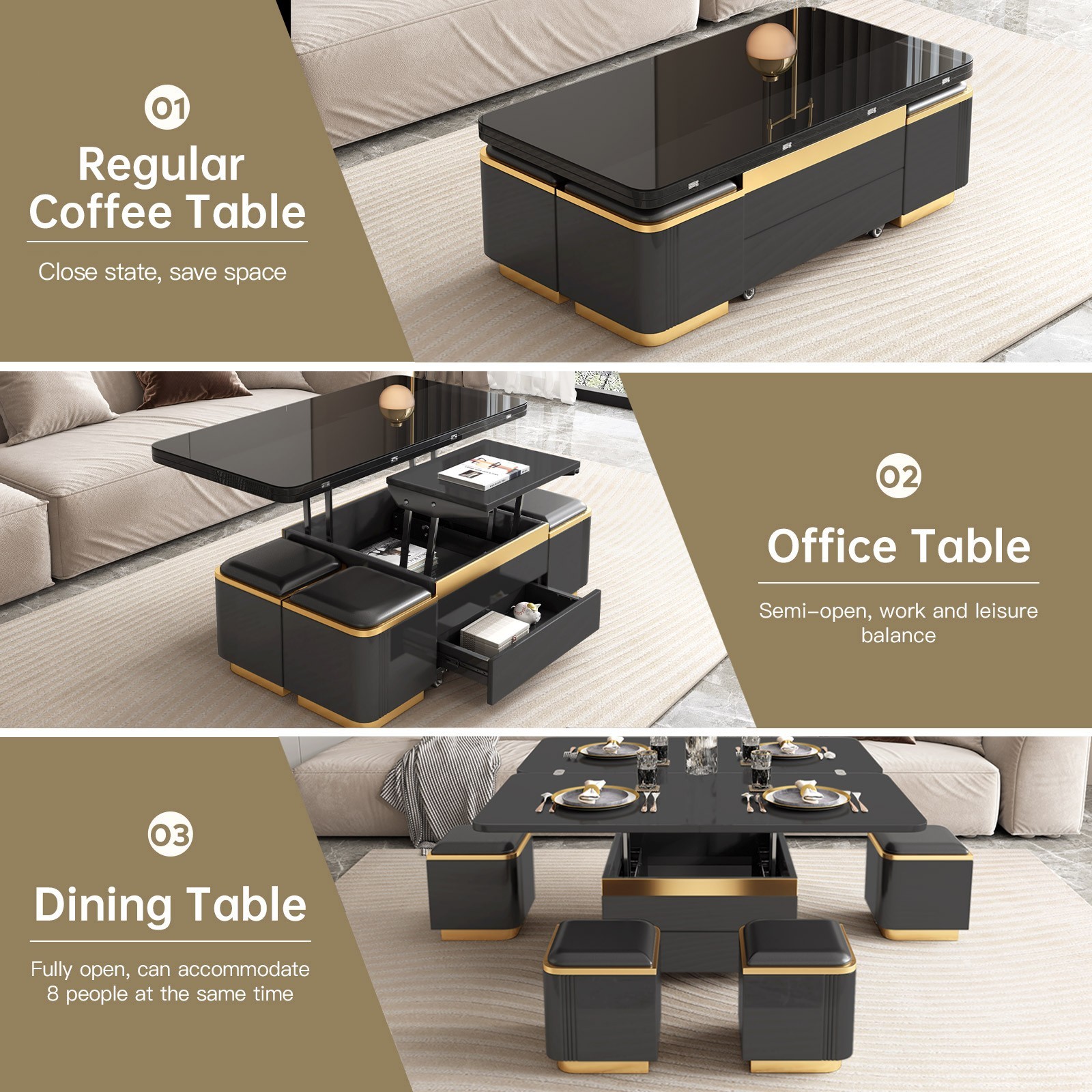 3 in-1 Multi-Function Lift Top Coffee Table, Dining Table with 4 Stools, Black Coffee Table with 2 Drawers for Living Room, Kitchen Multi-Functional Design: The Guyii Coffee Table effortlessly transforms from a stylish coffee table to a functional dining table in seconds. Elevate your dining experience with this adjustable and adaptable piece. Integrated Storage: Keep your living space clutter-free with two built-in drawers beneath the lift top. Ideal for stashing away remotes, magazines, or other essentials, the hidden storage contributes to the table's clean and sophisticated appearance. Space-Efficient Stools: The set includes four stools that nestle neatly beneath the table, making this multi-functional piece perfect for smaller spaces. When not in use, the stools seamlessly integrate into the design, showcasing a clever blend of style and practicality. Quality Craftsmanship: Crafted with durability in mind, the Guyii multi-function lift top coffee table is made from high-quality materials, ensuring stability and longevity. The sturdy construction supports both the table's functionality and your day-to-day needs. Perfect service for you: Guyii is your trusted source for premium products and exceptional customer service. If you encounter any challenges with your coffee table, please don't hesitate to contact us. We're committed to providing fast and friendly assistance to address any issues you may face. Your satisfaction is our top priority, and we're here to help.