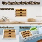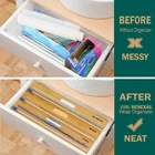 Wrap Neat 3 in 1 Wrap Organizer with Cutter and Labels, Plastic Wrap, Aluminum Foil and Wax Bamboo Dispenser for Kitchen Storage Organization ORGANIZED AND BEAUTIFUL - Make your kitchen storage neat and organized with this bamboo wrap organizer dispenser holder box. The aluminum foil organizer is designed for your different wraps kitchen storage organization accessories; SIZE: 13.25" L x 8.25" W x 3" H KITCHEN WRAPS STORAGE - Designed for plastic wrap, aluminum foil and wax paper; Not for rolls that are wider than 12"; The bamboo organizer for kitchen storage organization is 3" High; MEASURE YOUR DRAWER HEIGHT FIRST 21 LABEL STICKERS INCLUDED - Identify drawer contents instantly with the labels on the box; You can label the bamboo kitchen organizer clearly, or not use the labels to keep the clean look of the wraps holder 1 PIECE BOX WITH 3 SLOTS - This wrap organizer offers you different ways of organizing plastic wraps; You can put it in drawer or hang it on the wall; Bigger opening in the middle makes it easier to find the roll start BUILT-IN SLIDE CUTTER - With sliding cutter for every slot, it ensures a clean cut (YES EVERYTIME!) and hold each roll in place to keep it from losing the roll start during dispensing; USPTO Patent Pending Space Aid Wrap Neat 3 in 1 Wrap Dispenser with Cutter and Labels, Compatible with 12" Roll